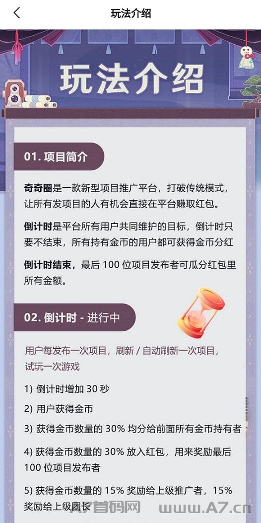 正文 奇奇圈,注册送1元可提现,发项目赚h包赚金b,持续** 168首码网 V评论者 /2023-03-24 10:55:47/1.87 K阅读 0324 奇奇圈,一个网络人脉、项目、资源共享的引流平台,免费发布项目,注册就送1元可直接提现,每天发项目赚h包赚金p,持续分h。VX扫码注册:VX:dd577686768注册送1元,加客服并发送ID激活后可直接提现,平台每天有倒计时活动(从早到晚),活动中发项目可以瓜分h包,发布、刷新项目和试玩游戏都可以获得金币,根据金币数量**,倒计时结束后金币清零。邀请二级分成,直推10%,间推5%,直推20人可升级团长,享团队5%分成。