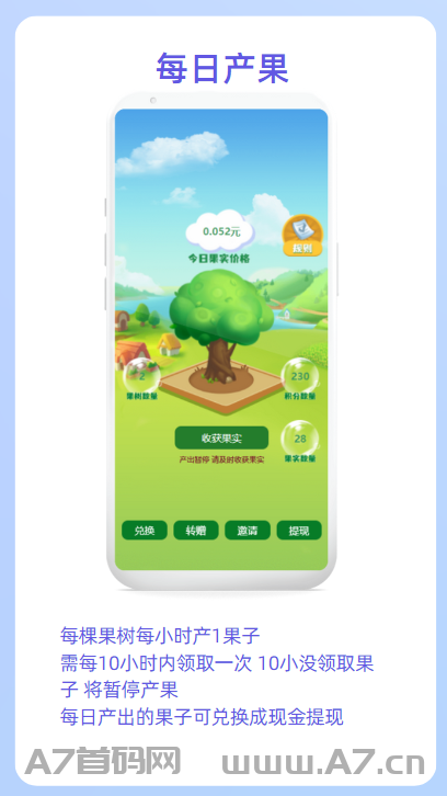 小绵羊(注册送500积分,能兑换一棵树 ,每棵树每天能产24个果子,价值1.24元,签到7天又得500积分 在兑换一个树 每天2.48元。每签到7天都能得500积分/1棵树)
