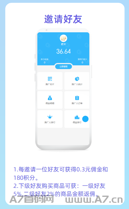 3. 下级好友购买商品可返佣给上级,一级5返佣,二级2返佣。