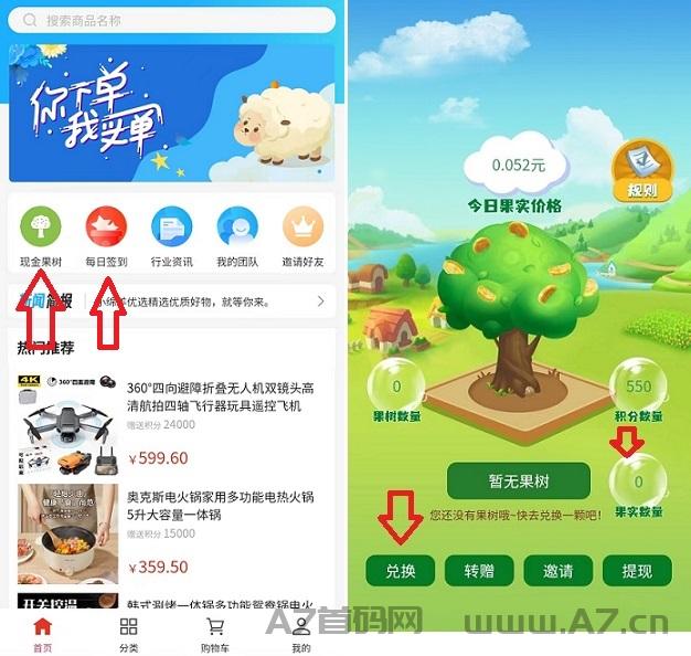 首页每天签到得积分,进入现金果树用注册送的500积分兑换1棵果树,果树每小时产1果子,每个果子现价值0.052元,每10个小时需要领取1次,不领就不继续产出了。