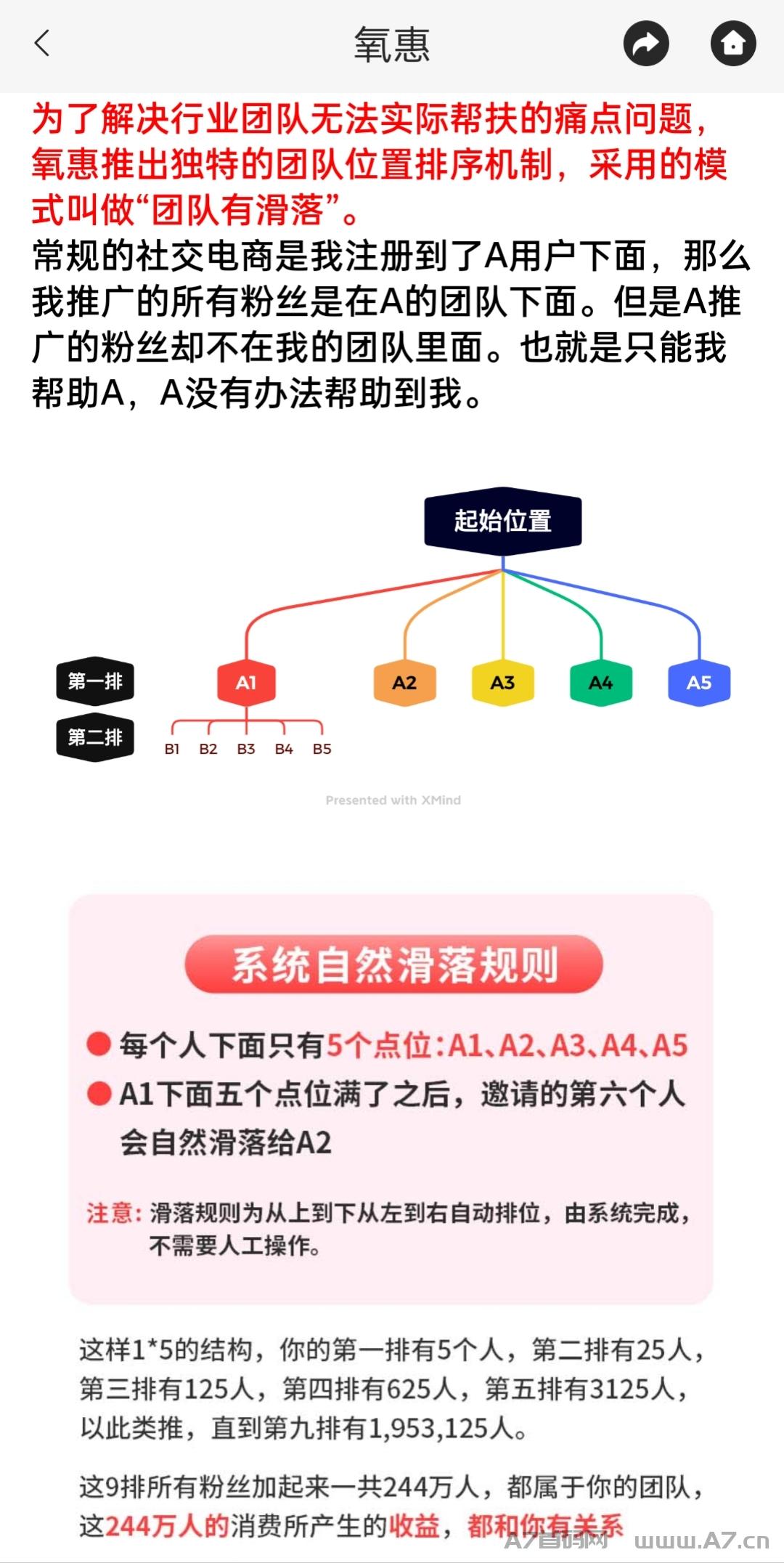 氧惠独特的滑落模式,让你不止是自己在建团队,你的上级,氧惠公司平台都会按照一定的算法规则,自动给你“滑落”用户,不仅用户滑落,帮你壮大团队,佣金也跟着滑落,正如我们上面提到的佣金模式,一样受用。