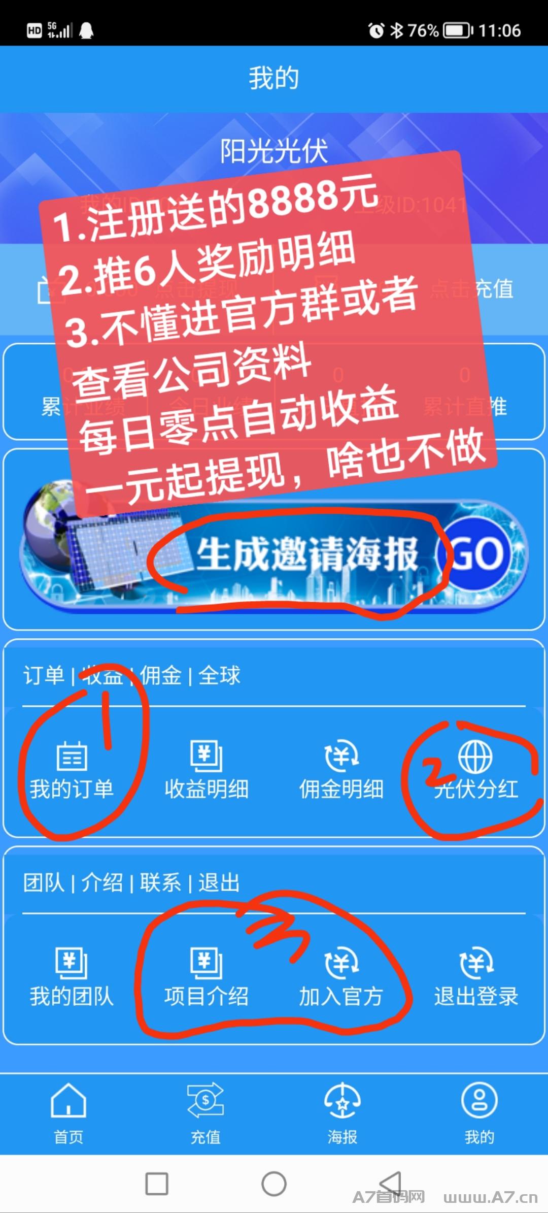 正文 刚刚上线,刚刚上线,长久稳定项目注册就送福利,阳光光伏国际新能源可考察项目 qq111111 V评论者 /2023-04-07 11:37:22/1.96 K阅读 0407 你是不是在找长久靠谱项目,它来啦,赶紧玩阳光光伏国际新能源🔥3月7正式上线,玩法1.注册成功就送8888元现金,在个人中心点击我的订单即可查看,每天零撸1~100元2.在首页最低购买19元激活,也可多个订单购买,叠加收益,每天0点自动结算收益3.直推一人奖励4元,还有投资金额5%推荐奖,如100元奖励9元,每天推6人奖励50元4.满1元即可零撸提现,可零撸🔥可投资🔥可推广,低投入!日入几百过千很容易的!