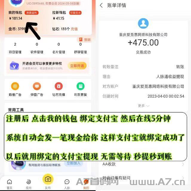 注册后,绑定支付宝,然后在线5分钟,系统自动发送一笔现金给你,以后就用这个支付宝提现,秒提秒到账。