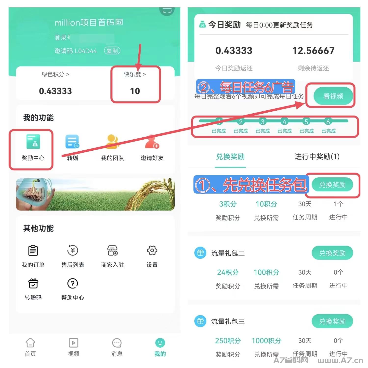 ②、任务包兑换了每天看6个广告,产出够10积分后就可以再兑换一个任务包。
