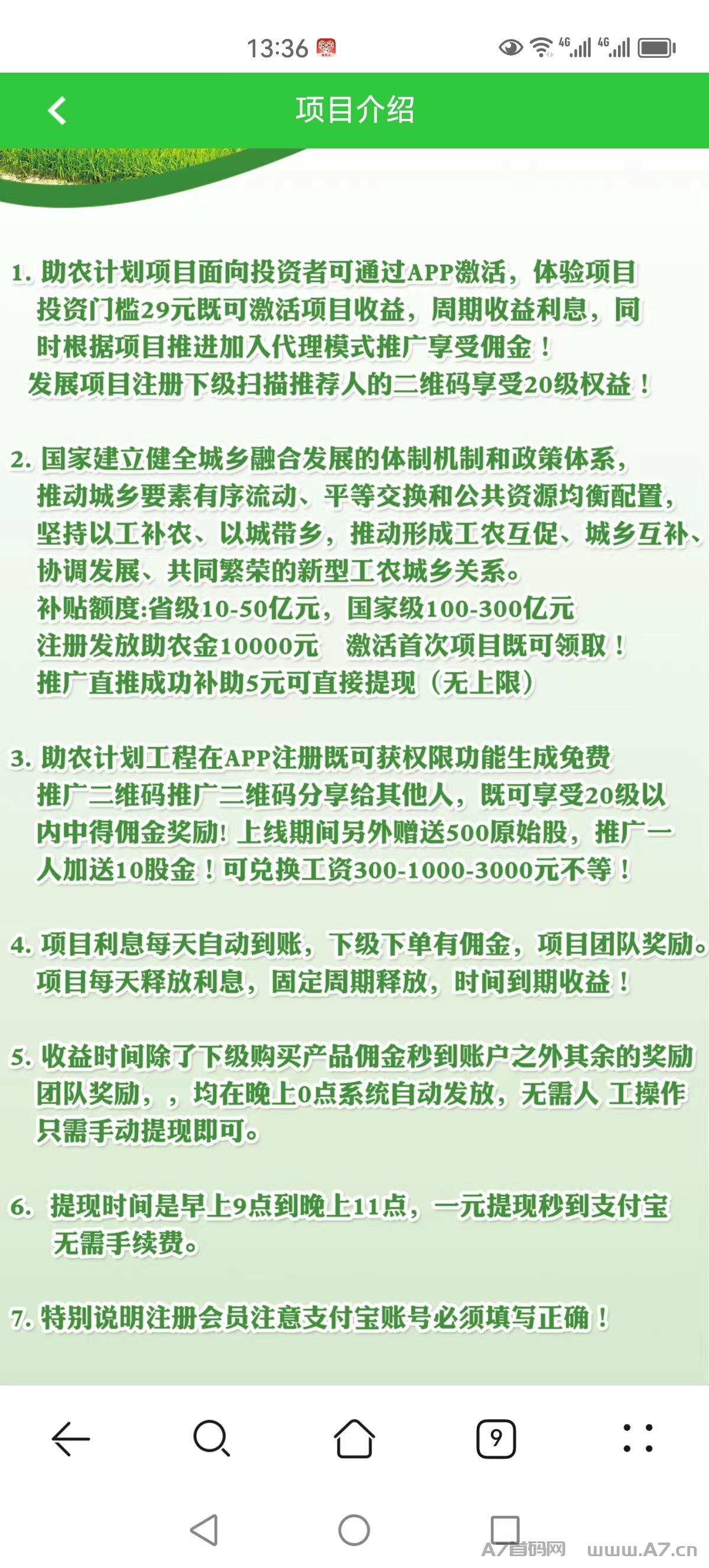 正文 中华g创,助力乡村振兴,注册送奖励可提现,福利多多,提现无限次秒到!! aa1319 V评论者 /2023-04-18 15:05:42/1.88 K阅读 0418 中华g创助农计划有效直推一人奖励5元,可直接提现(无上限)乡村振兴注册送10000元助农金激活每天收益1元内测期间另外送500原始股金,推广一人有效会员加送10股金累计600股金每可领工资300元累计1000股金每可领工资1000元累计2000股金每可领工资3000元关于提现问题提现时间:早9点到晚上23点绑定限制:每个支付宝绑定三个账号提现金额:支付宝提现1元起,提现秒到,不扣手续费
