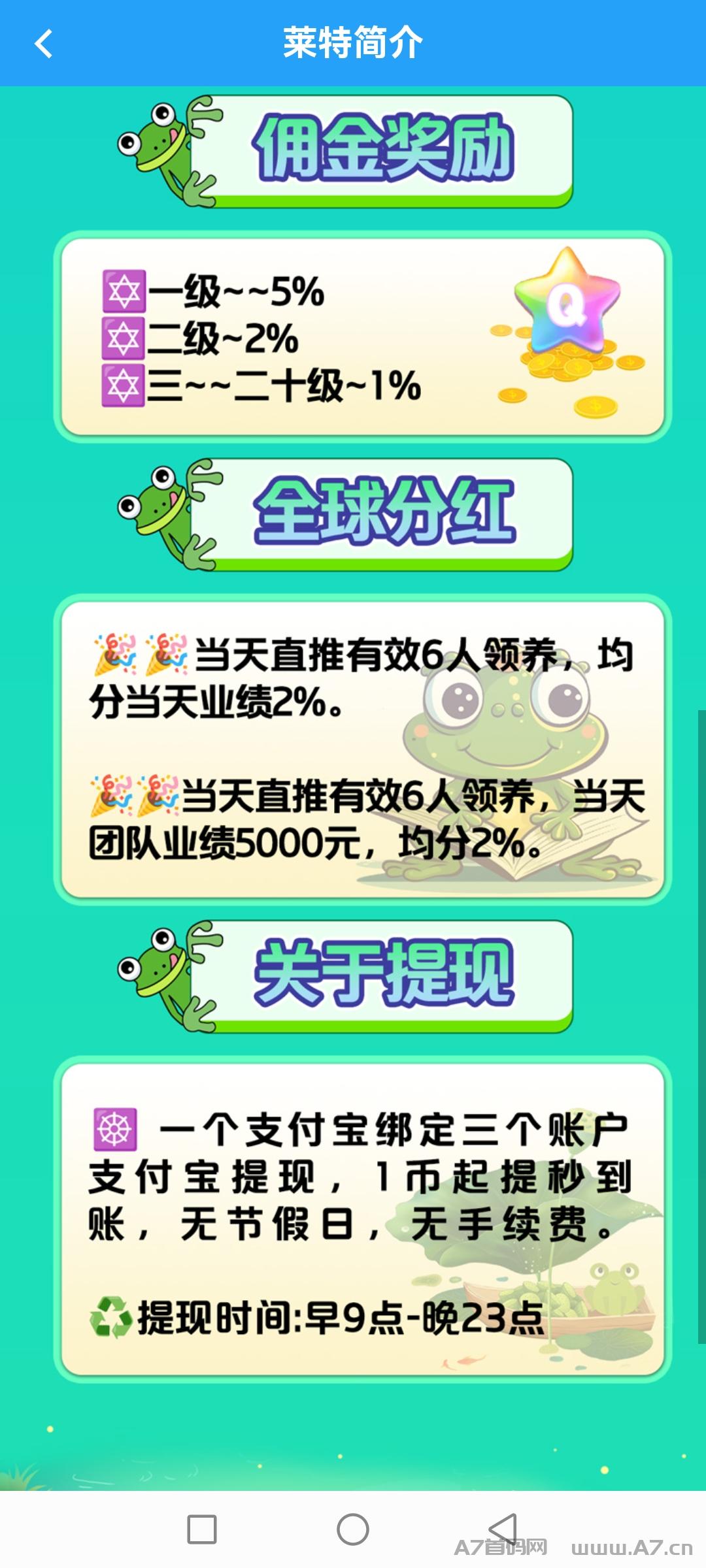 正文 莱特青蛙刚出一秒,注册赠送体验蛙 bpk555 V评论者 /2024-04-09 19:40:01/2.24 K阅读 0409 首码莱特青蛙刚出一秒注册赠送1688元体验蛙激活每天自动产币一枚,可直接兑换1元提现领养30元普通蛙 每天0点自动收益2元,领50天领养100元初级蛙 每天0点自动收益6元,领30天领养499元高级蛙 每天0点自动收益31元,领30天所有收益一元起提现秒到账无手续费联系方式微脉圈: