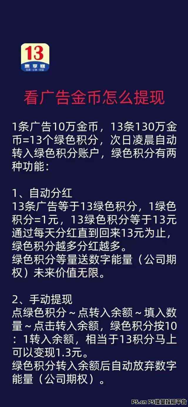 正文 13惠享赚超强零撸每日享** zhuzi123000612 V作者 /2024-07-25 20:19:21/1.23 K阅读 0725 13惠享赚在APP首页里面看广告完成十三次广告获得金币凌晨自动转换积分13个,**一比一扣除一个就等于一块积分交易系统马上上线,官方保底0.1回收绿色能力随着金币转化积分一比一转化,购物也能获得邀请13个人获得公排团队完成零撸,绿色能力等于后期的股份早上车早抓利APP进群找我拿