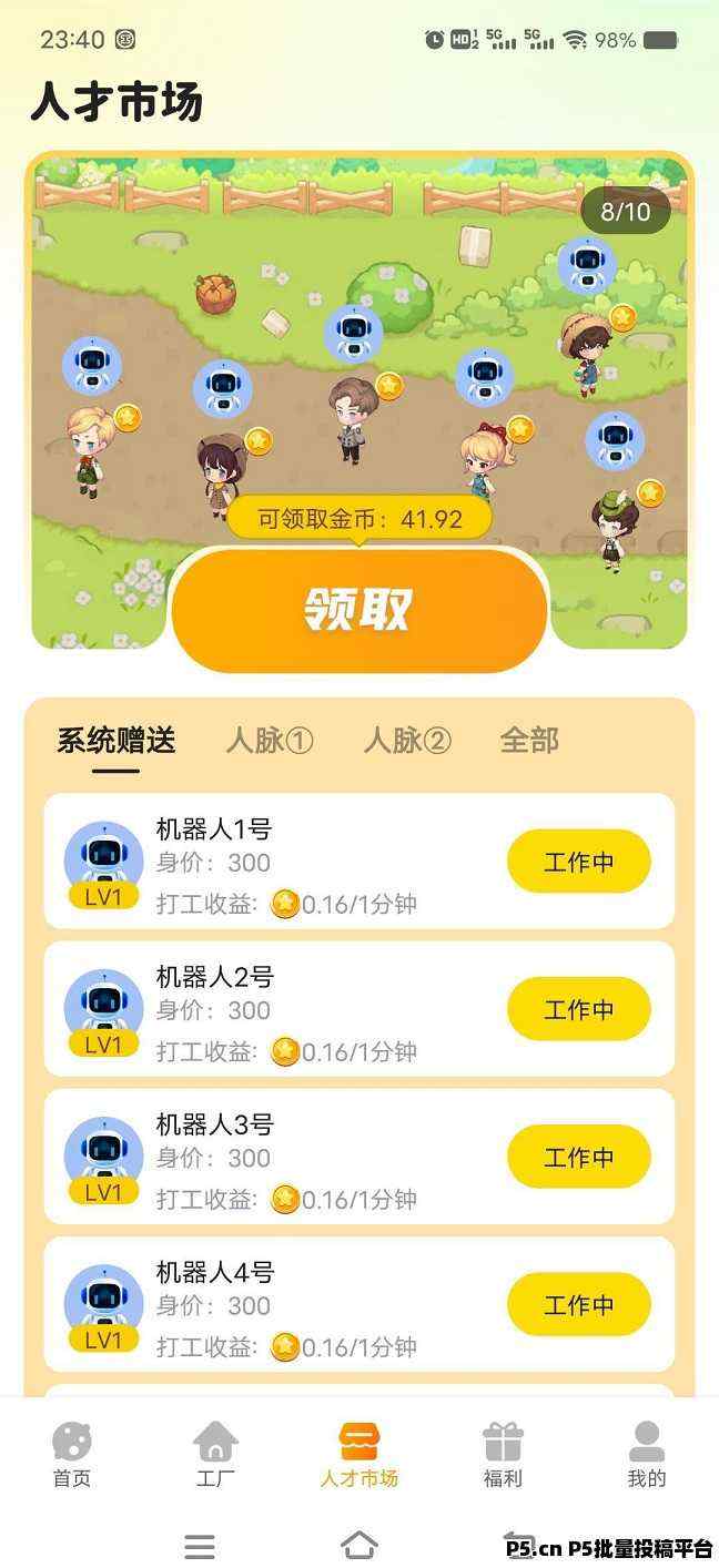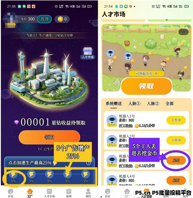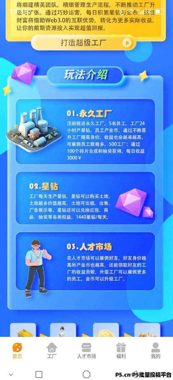零撸模式:必须先注册再下载才送。无需任何投资(注册赠送即赠:永久工厂,专属领地,5名工人)