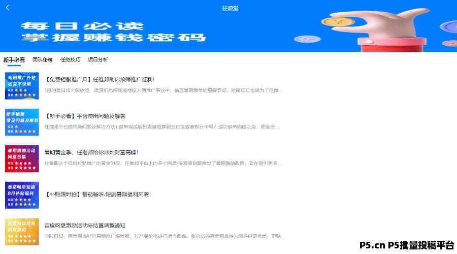 今天,我要为大家介绍一个备受关注的创业平台——任推帮。在此之前,我看到了不少朋友通过任推帮月入过万,甚至数万,实在忍不住要分享给大家。任推帮是一个专注于拉新推广的第三方任务平台,为广大用户提供了一个通过拉新和网盘分享资源来实现盈利的途径。下面,我就来为大家详细讲解如何利用任推帮平台创业,包括注册、挑选任务、执行推广以及提现等环节。