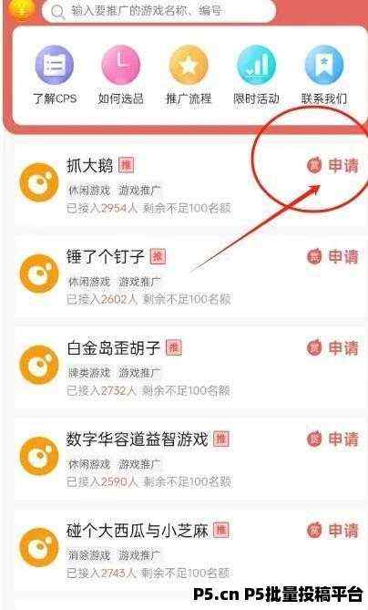 首先,你注册登录后,你在首页可以看到很多小游戏,点击【申请】,就能获得推广链接。