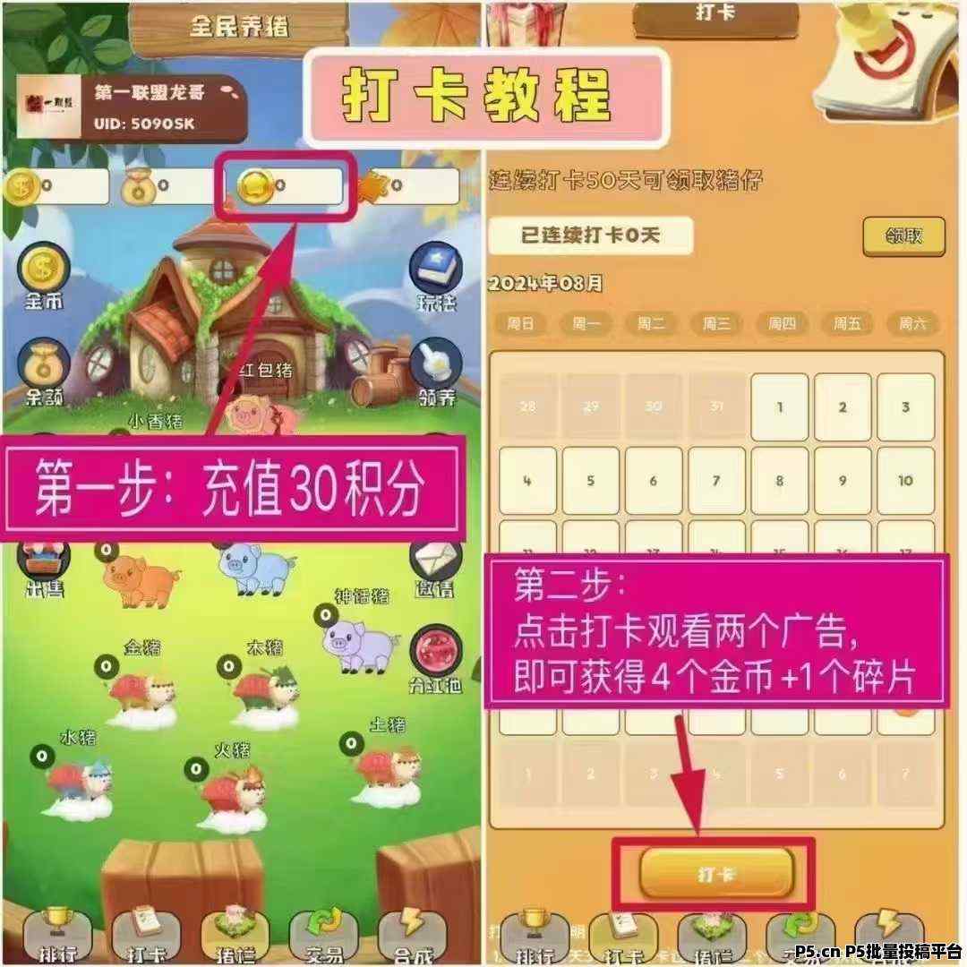 全民养猪火爆上线没上车的抓紧时间上车,全网对接大小团队长,待遇拉满。只需30的本金充值积分,每天用积分去打卡给4个金币和1个碎片