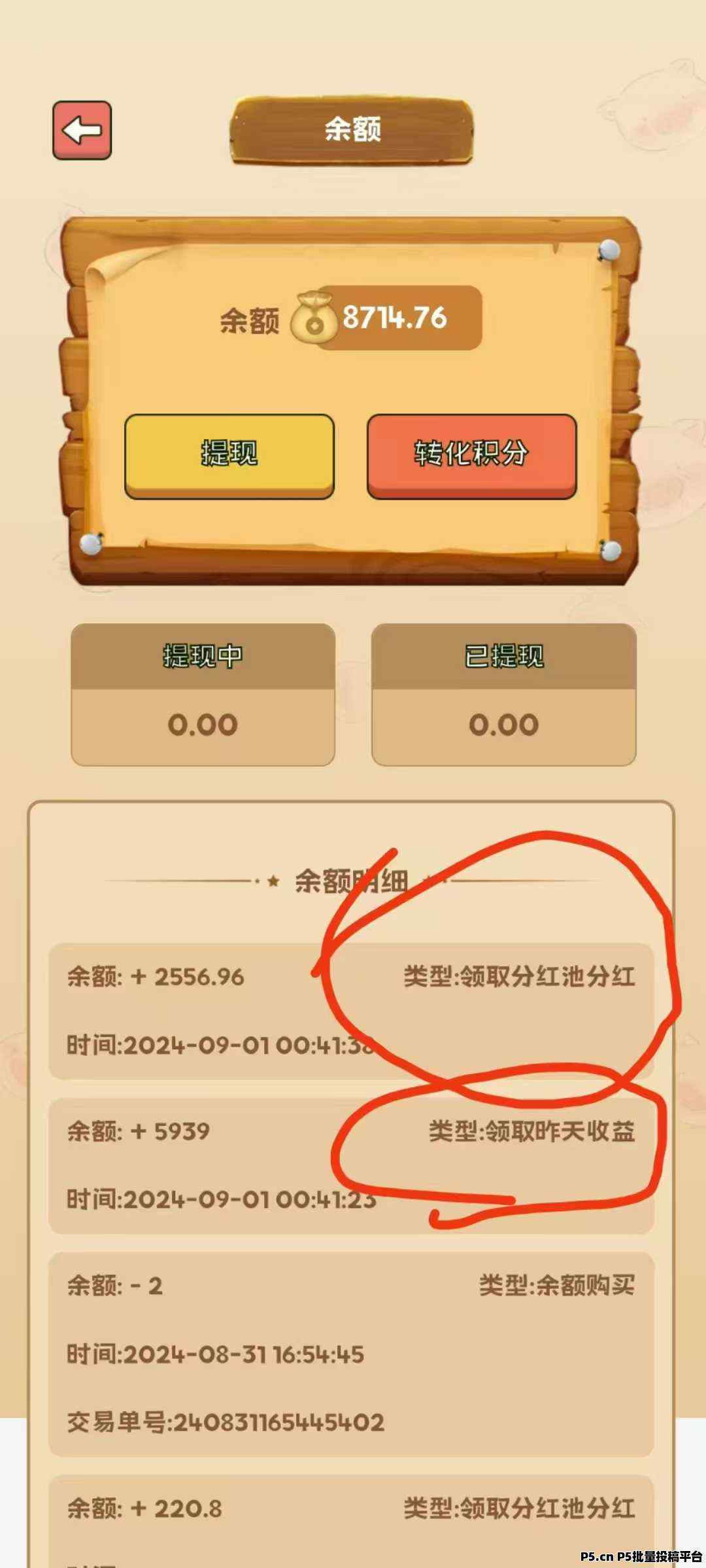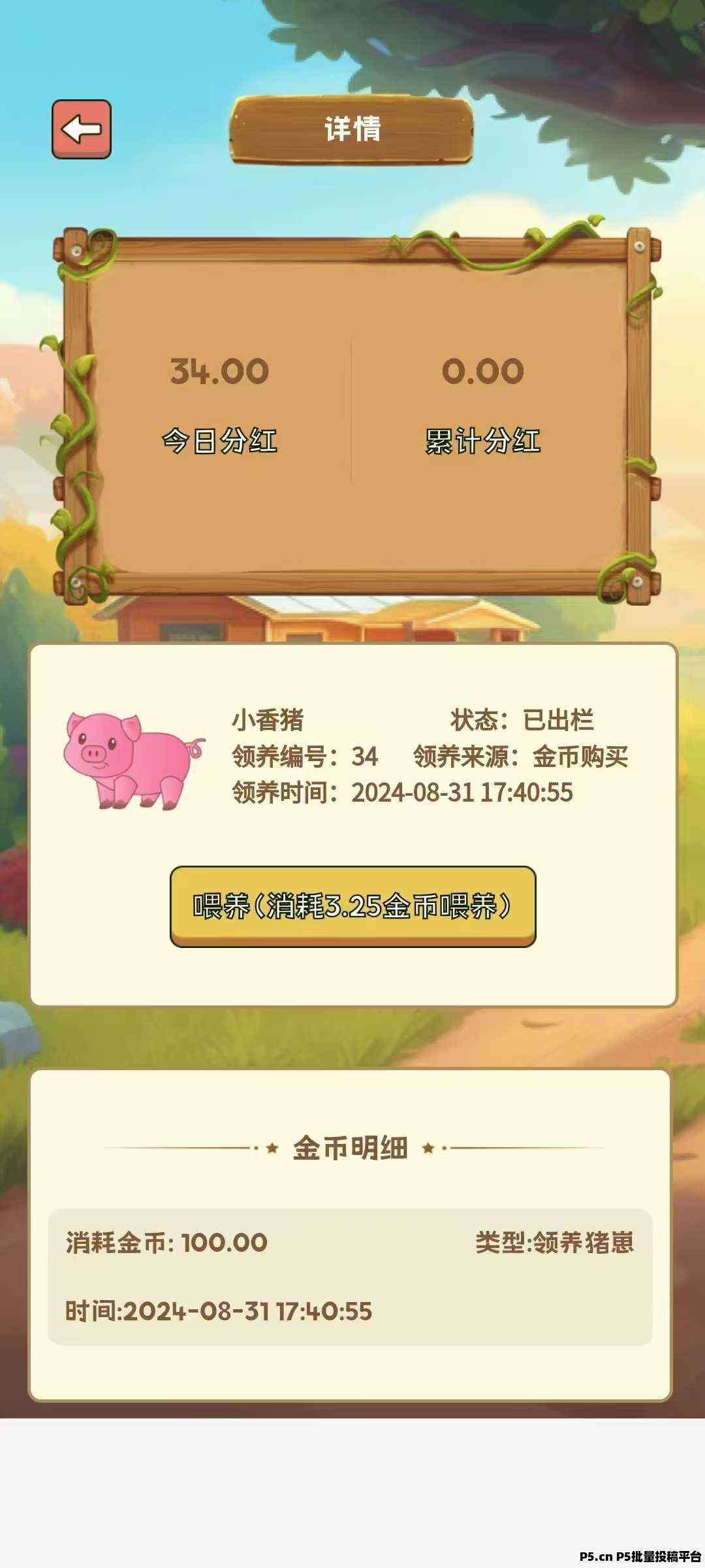 1个金币价值10米秒变现7个碎片有概率合成**猪每天**100米和小香猪每天**34米。集齐金木水火土猪合成必中**猪。小投资大回报,不锁仓不锁本,不想玩随时下车提现。金币卖成余额,在吧余额转30去兑换积分然后明天继续打卡,玩的越久赚的越多,每天冲这个操作30就可以无限循环。