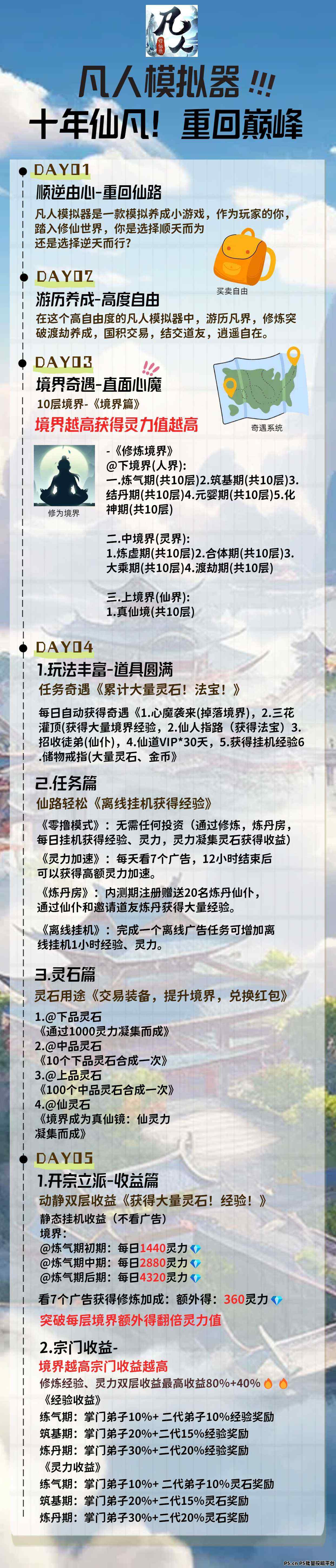 结合了修仙元素与社交营销模式,在高自由度的游戏世界中,玩家可以通过修炼获得灵力、