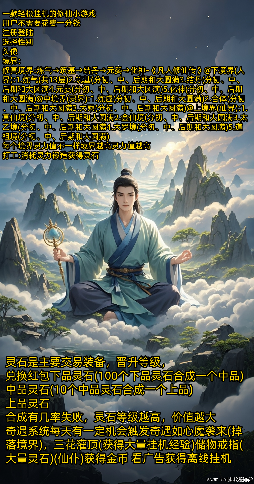 动静双层收益《获得大量灵石!经验!》**挂机收益(不看广告)境界: