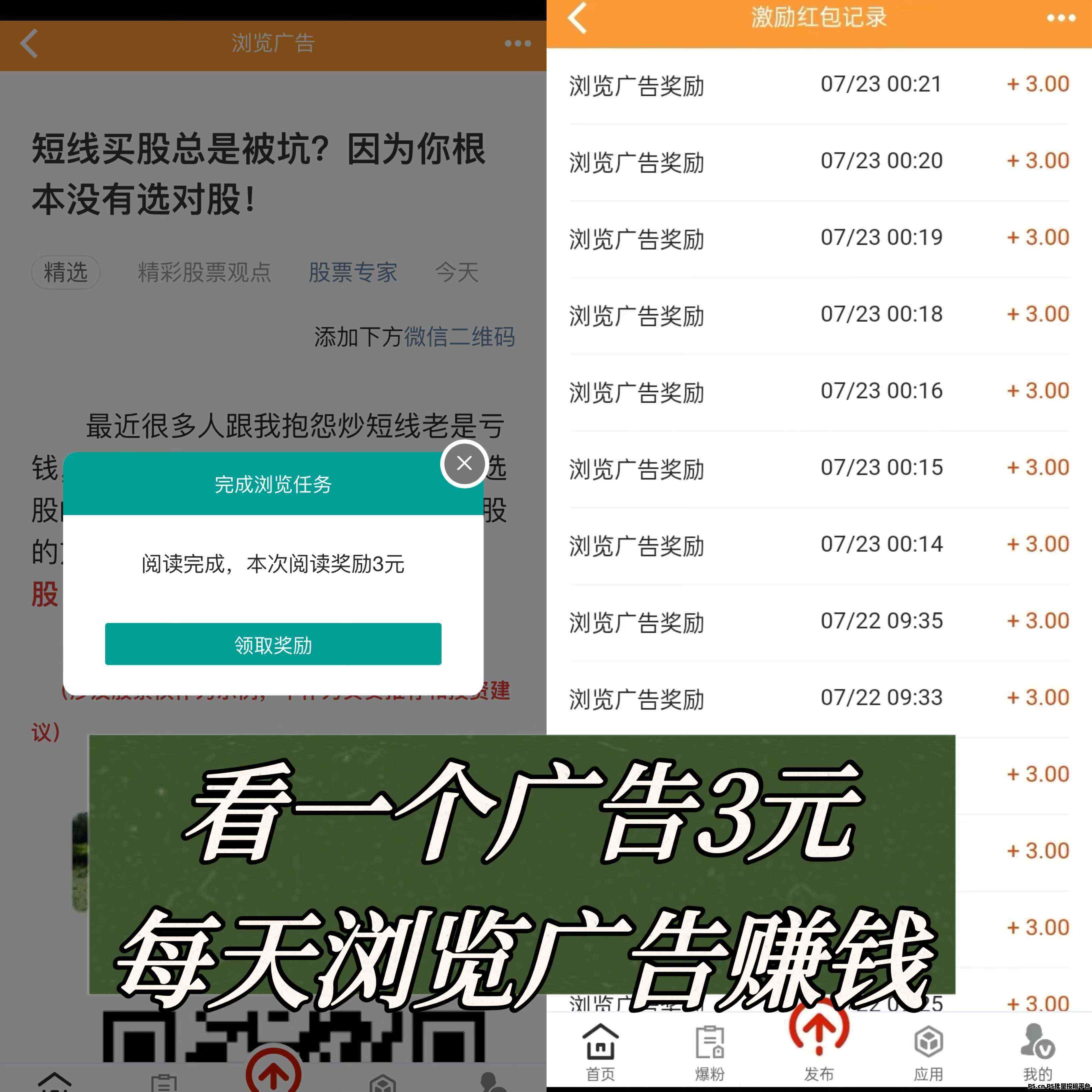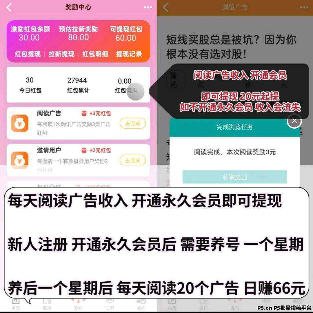 正文 巨量广告,浏览广告赚钱,注册人人都能赚钱 lzb1790050733000979 V作者 /2024-09-18 09:03:32/1.71 K阅读 0918 巨量广告浏览一个广告3元,浏览广告赚钱,注册人人都能赚钱。不管您是:宝妈、学生、上班族,注册巨量广告,每天阅读广告赚钱。赚钱攻略:新人注册 开通永久会员后,养号一个星期左右,每天阅读20个广告日赚66元。亲测提现秒到,靠谱每天可以浏览7个广告,每条广告3元红包,养号一个星期左右,每天可以浏览20个广告,日赚保底66元,提现秒到所有广告红包均为第三方广告商付费支出,平台无任何泡沫。