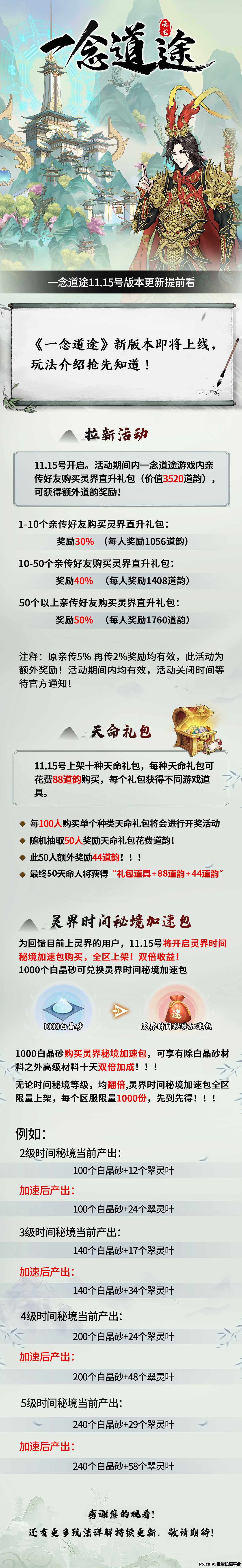 一念道途已于11.8号正式上线,预计11.15号新版本更新, 拉新活动,全新天命礼包系统,灵界时间秘境加速包等均在11.15号上线。并且会在11.15号版本更新后将开启新区服,等你而来!下面简单为大家介绍一下这三个内容