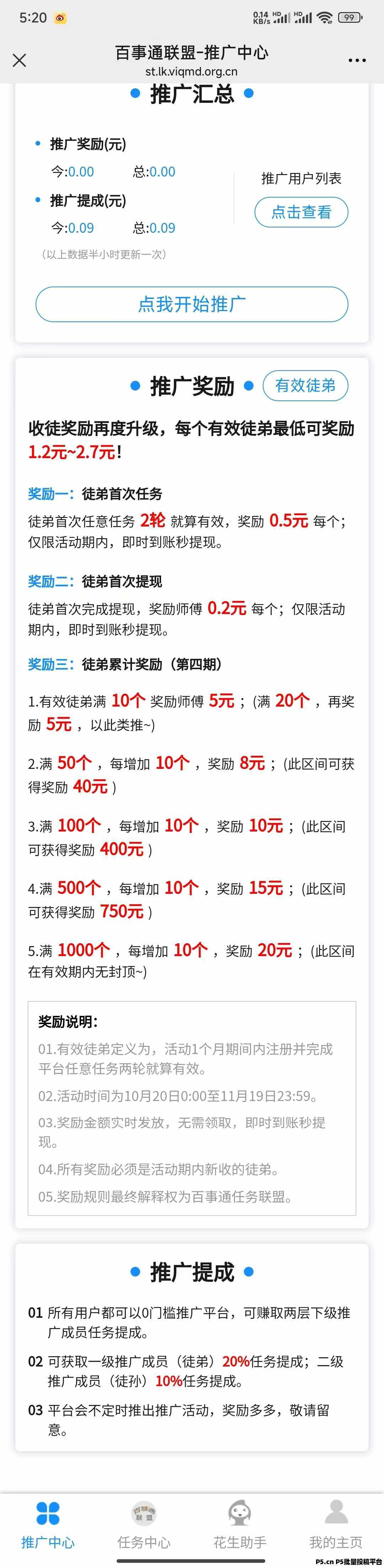 公众号文章浏览5秒,每轮0.45元,一轮28篇文章3分钟搞定,最高可做8轮,公众号关注每轮0.25元一轮10个关注,最高可做6轮,每天零撸5.1元。签到红包最高0.3元。还有京东优惠券可领,购物返佣金。要想赚的更多就多推广下级,我们可以赚取两层下级推广成员任务提成。可获取一级推广成员(徒弟)20%任务提成;二级推广成员(徒孙)10%任务提成。平台会不定时推出推广活动,奖励多多。目前平台活动一个有效徒弟奖励0.5元,提现奖励0.2元,3元以内提现秒到账,有效徒弟超过10个,奖励5元,超过50个每10个人奖励8元等等活动。
