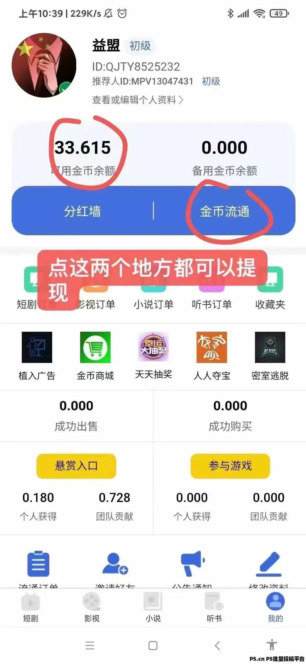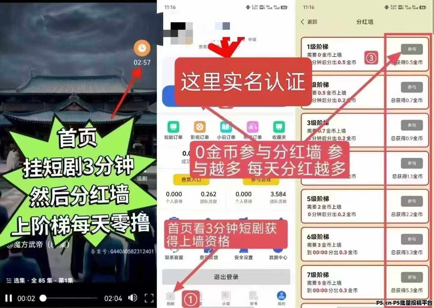 每天花3分钟随便点一部短剧看就可以开始任务了,我们主要完成**墙的任务,先看3分钟你才有资格做任务。1~4级阶梯是无门槛的,无论是谁,每天都可以点击参与,马上产出金币,参与完4级阶梯,就会得到1.1金币(目前1金币=1块钱)。