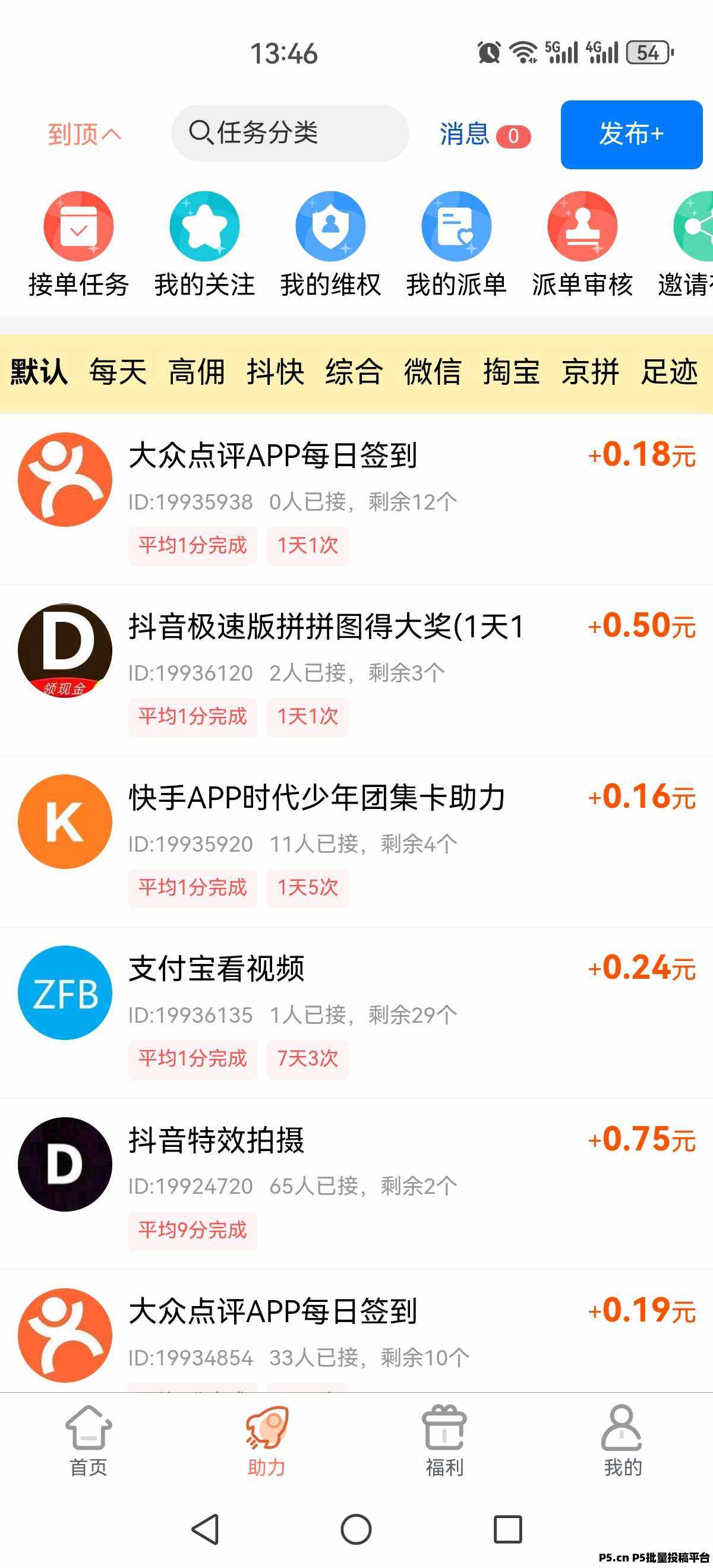 任务类型丰富,包括拼多多、天猫、今日头条、淘宝等平台的助力任务。