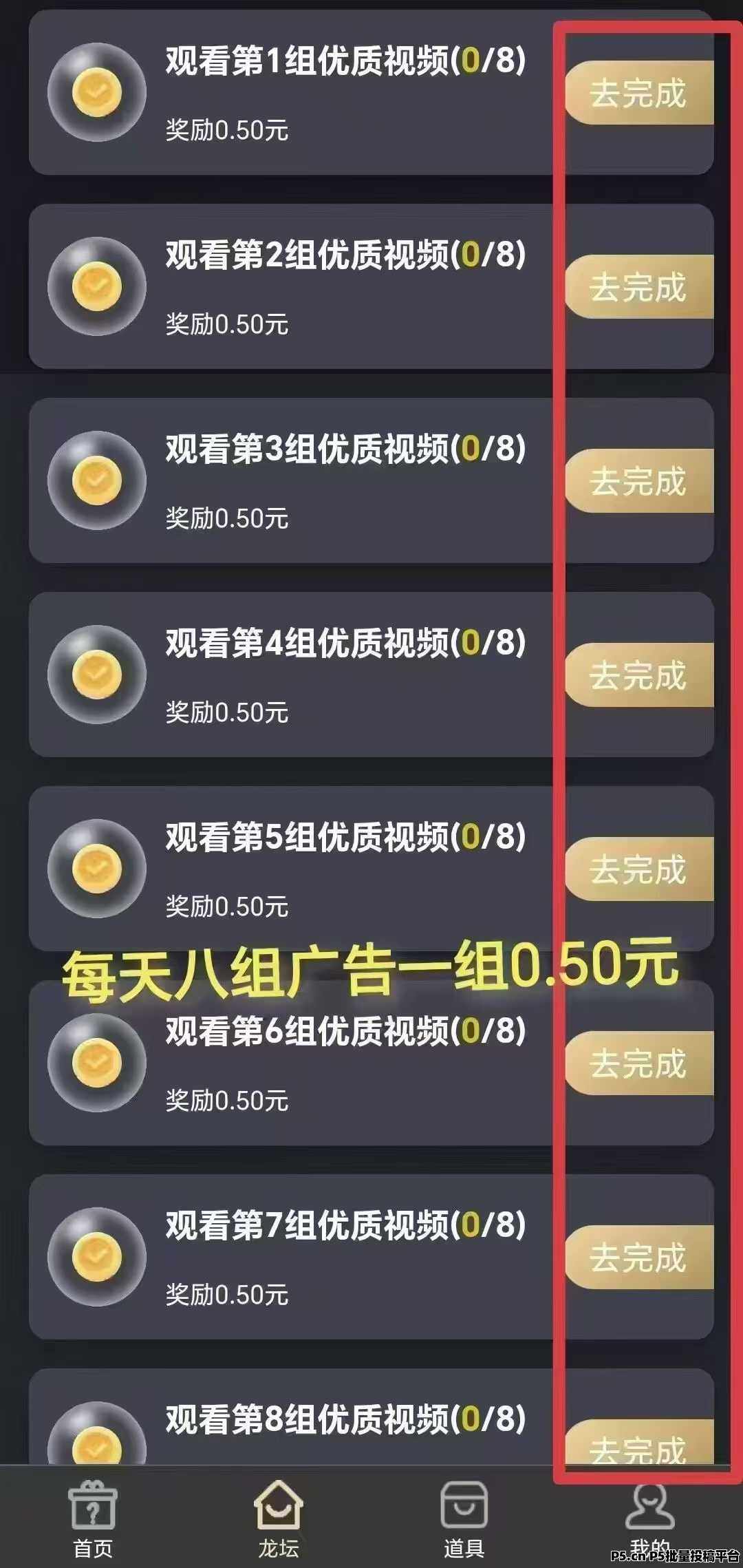 龙坛社区每天提供8组广告,每组广告只需轻松点击,就能获得0.5元的奖励。无需挂机,无需复杂操作,每天动动手指就能赚取4元零花钱。