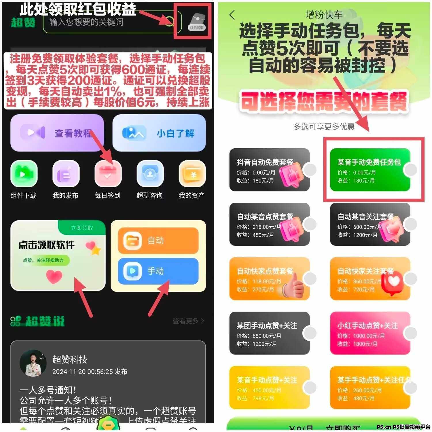 1、注册可以免费领取体验套餐,选择手动任务包,每天点赞5次即可获得600通证;每连续签到3天获得200通证