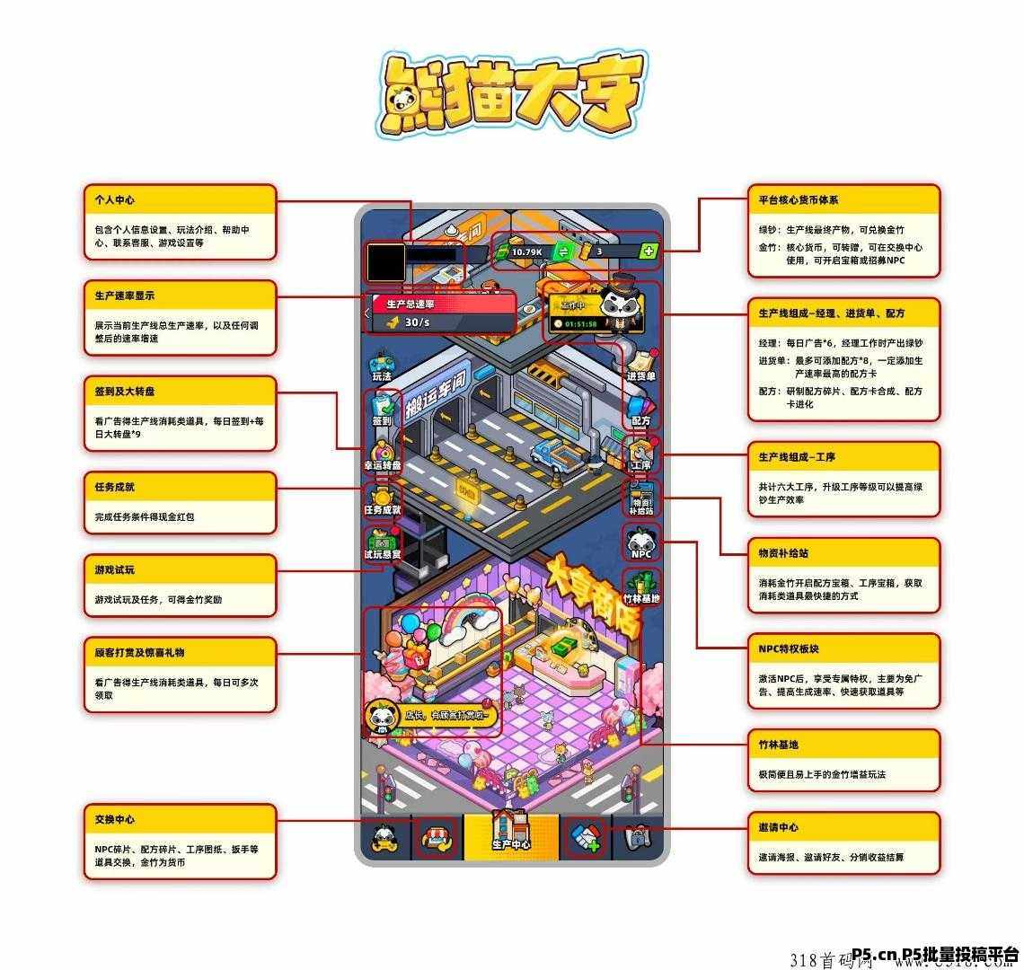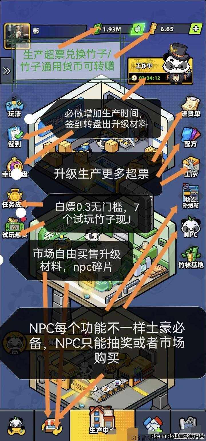 攻略:熊猫大亨零撸,用户石名后,通过签到,任务成就,限时活动,幸运转盘,竹林基地探索,玩赚中心等获得奖励