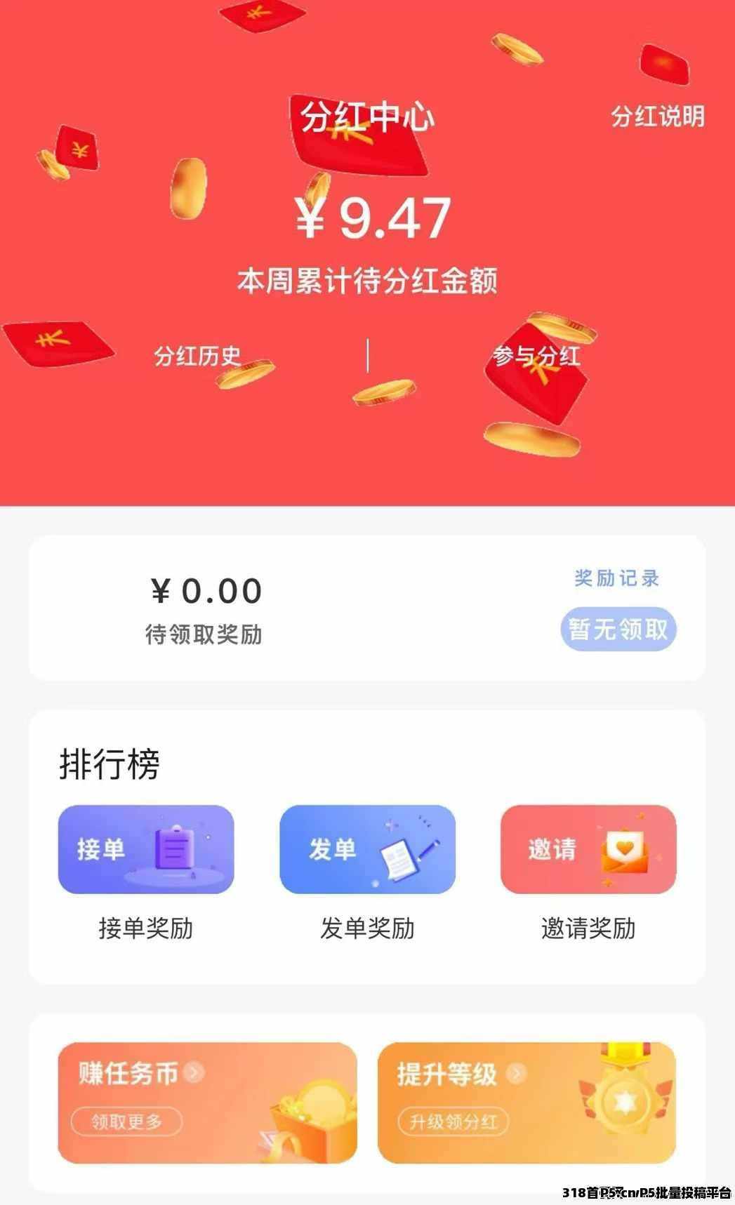 另外平台有接单排行榜 发单排行榜 以及邀请排行榜。每周在榜人员可获得额外奖励