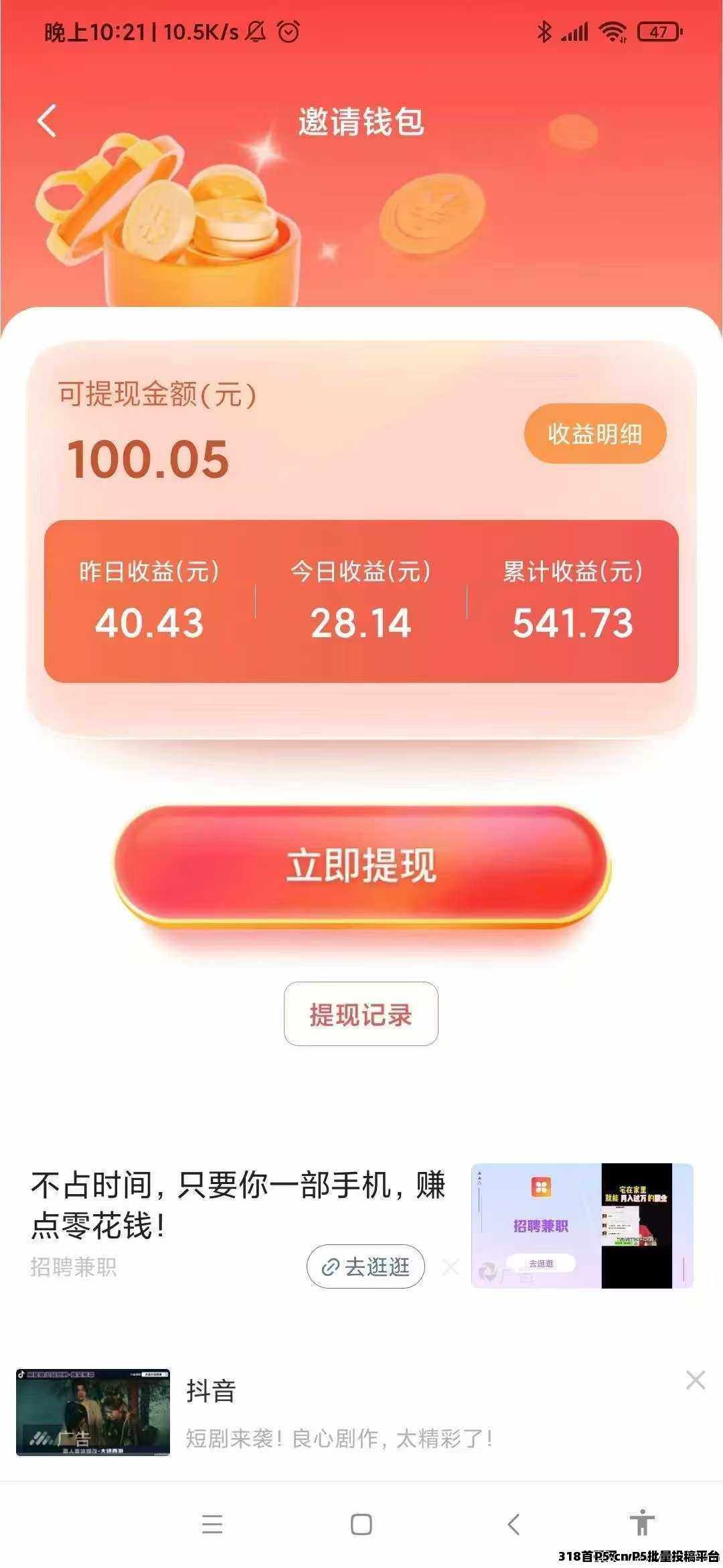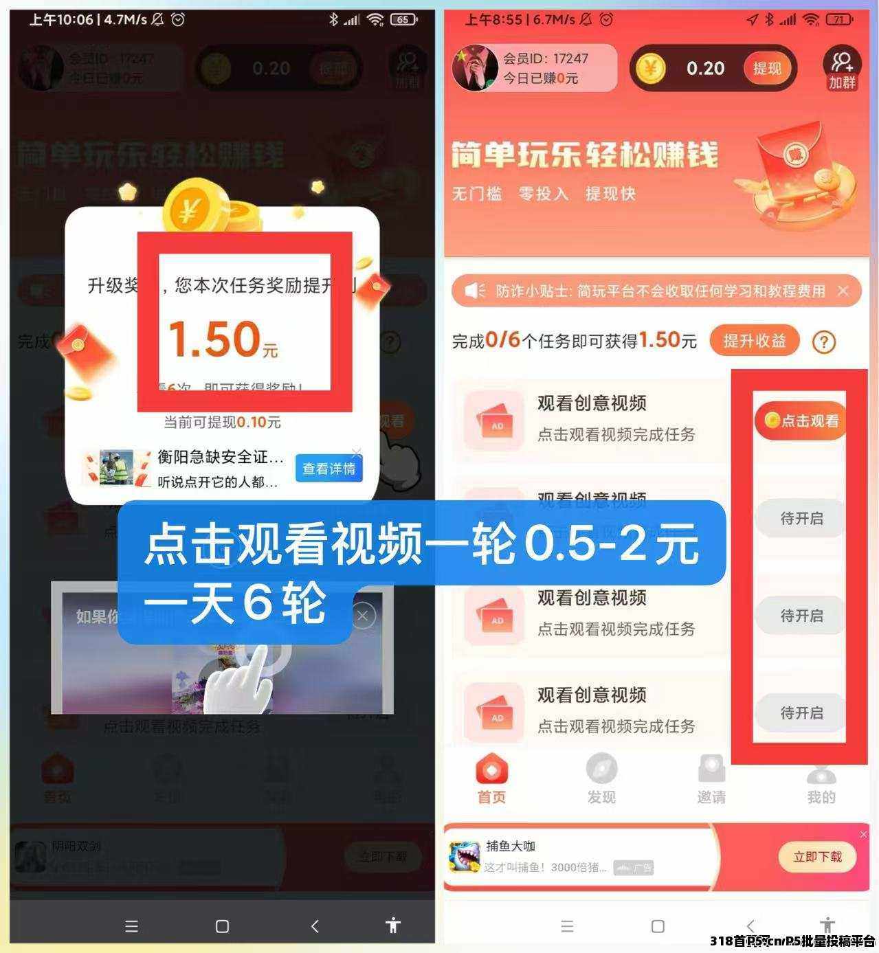 正文 简玩红包版,利用空闲时间看广告每天饭钱就有了 yimeng000148 V作者 /2024-12-11 21:20:47/661阅读 1211 广告联系客服QQ:55826758 【在线投稿】 《简玩V2》新版本不养机看广,有老铁反馈高的一天都能撸20元以上一轮6个广告 每轮0.5-2米随机,每天看12轮 一天大概5-20提现支持微信支付宝基本都是秒到,邀请也有收益