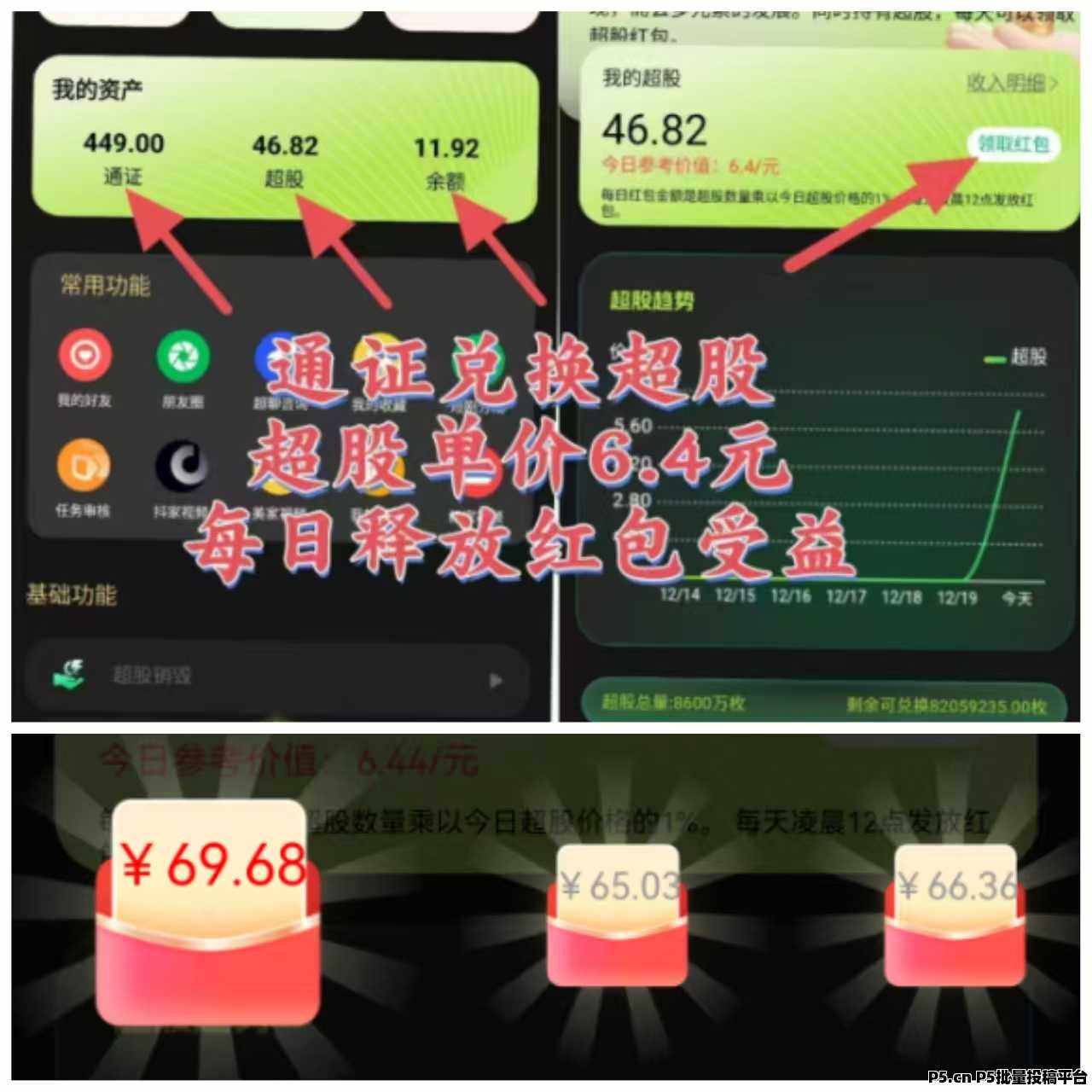 2、任务审核后获得通证600 通证和签到70个去兑换1个超股,零点后抄股页面里领红包,按超股价值的 %1 分洪!