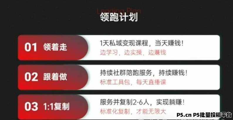 第三,一比一复制。我们的领跑计划就像流水线一样,怎么把你培养成功,让你赚钱,你就可以把你身边的人复制成功,你只要把他们推荐进来就行。