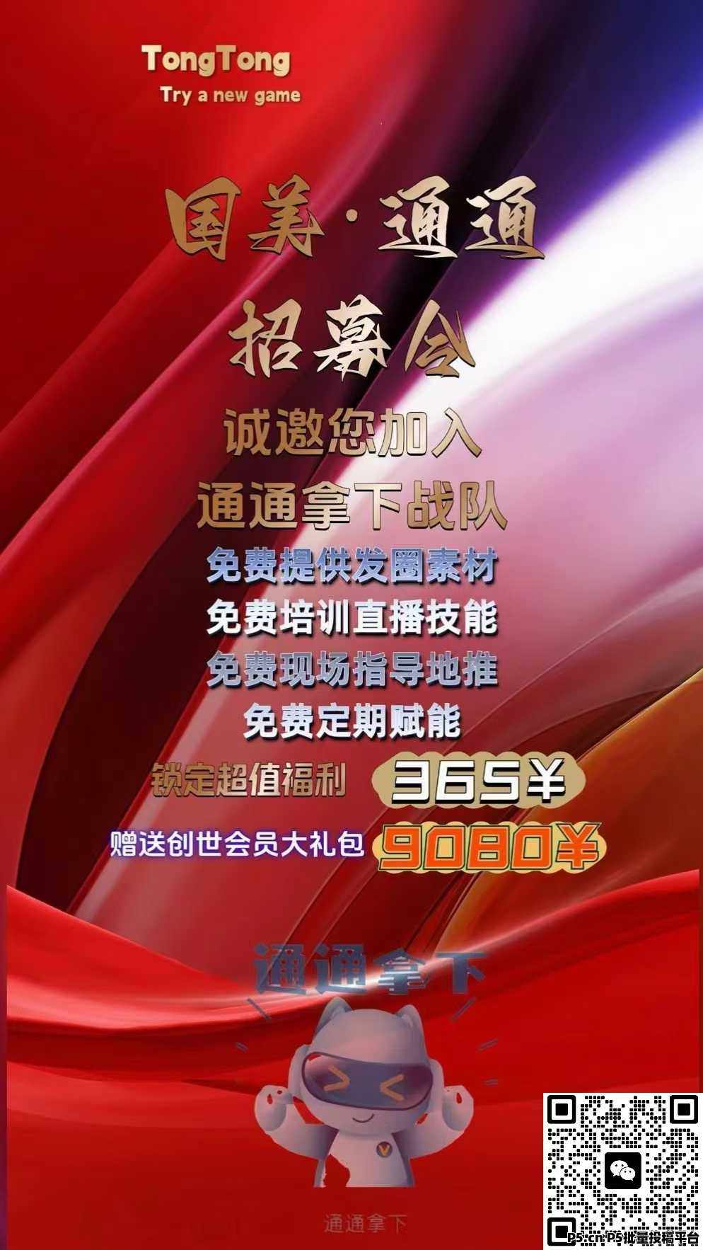 2、可以免费获得推广员身份,但是必须通过我的推广码注册才可以。每个通通的用户都可以通过推广值的积累晋升成推广员(无渠道推荐关系的自然注册用户无法成为推广员),推广值目前暂定3000点,推广活跃用户积累10点,每日登录30点,首次修改头像60点,首次修改昵称60点,首次发视频60点,实名60点,建群60点,购买创世礼包3000点直接晋升,以上内容不定期更新,以通通平台通知为准。不想花钱的,可以积累推广值升级,所有人都不是必须买礼包,礼包是商品,不是资格,请注意措辞,用户坐电梯还是爬楼梯自己选择。