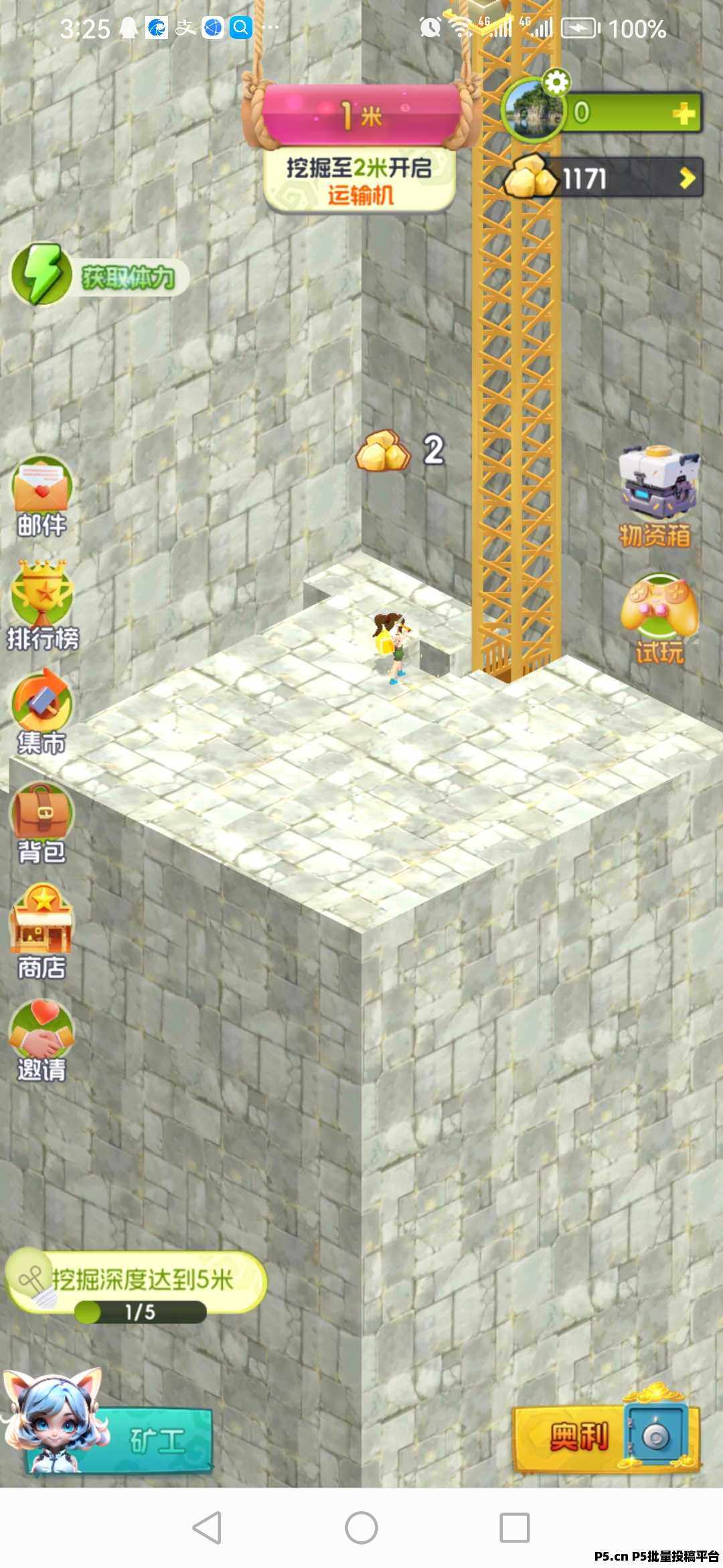玩法介绍:①每日看10个广告和简单任务得180体力,1体力可挖1000金矿,金矿可熔炼成金币,金币预计0.02米1个,通过强化矿工装备增加挖金矿速率,金币可在物资箱抽取更多矿工,还可玩各种游戏。