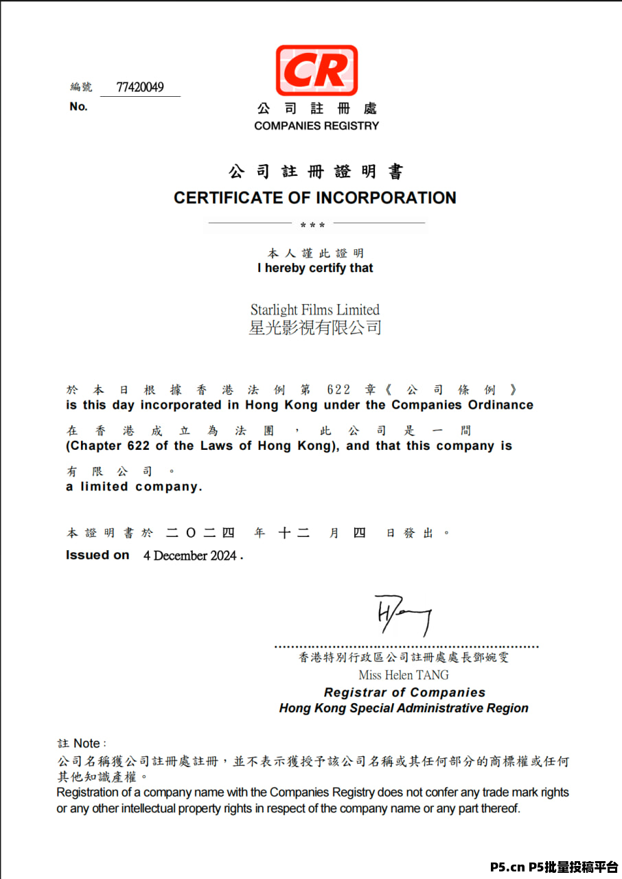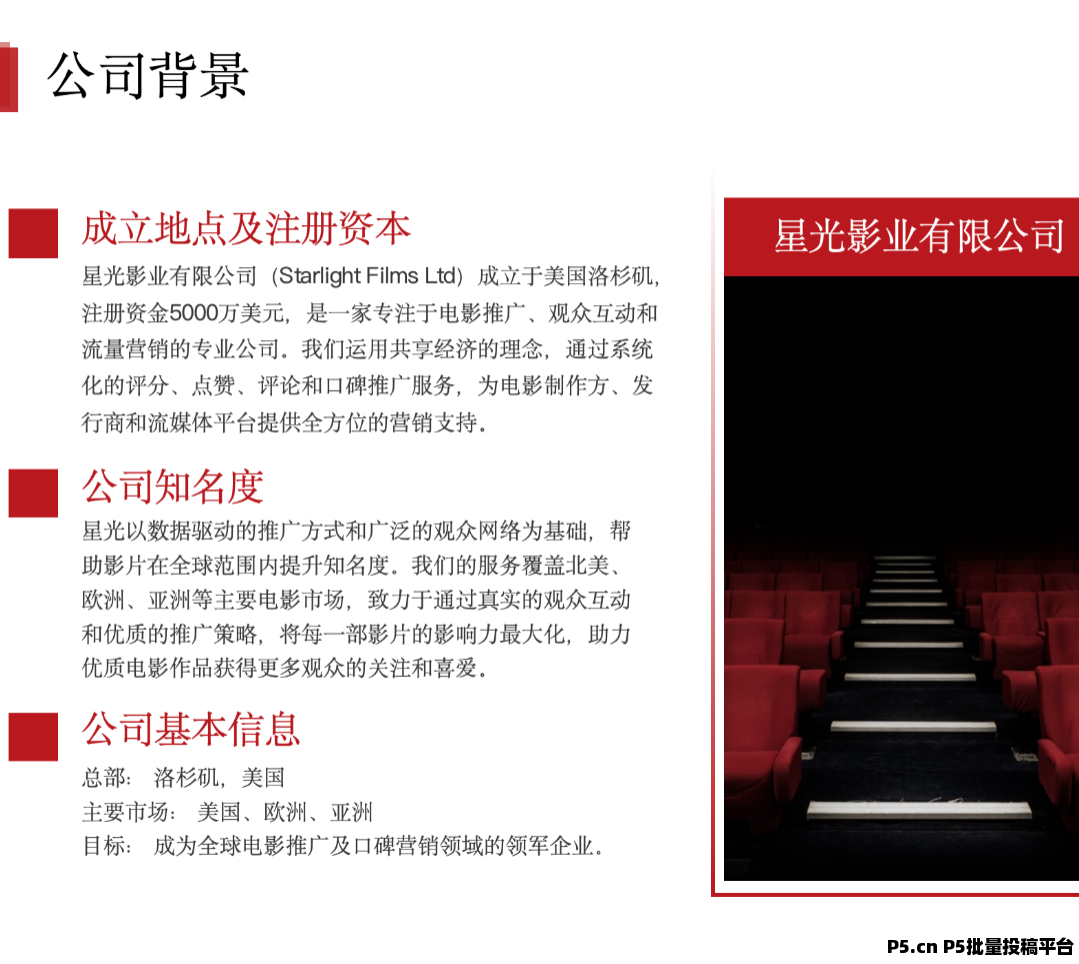 星光影业公司(Starlight Films Ltd)2022年8月10日成立于美国洛杉矶,注册资金5000万美元,星光影业以数据驱动的推广方式和广泛的观众网络为基础,帮助影片在全球范围内提升知名度。我们的服务覆盖北美、欧洲、亚洲等主要电影市场,致力于通过真实的观众互动和优质的推广策略,将每一部影片的影响力最大化,助力优质电影作品获得更多观众的关注和喜爱,同时为进军中国大陆市场,在今年12月份在香港设立分公司。