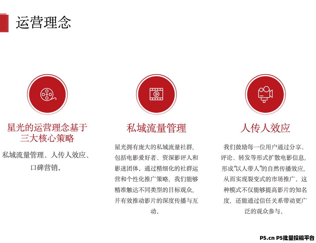 星光影业公司的运营模式是公司与所有合作伙伴一起共同经营这份流量,让这份流量在中国市场变得有巨大的影响力,从而让更多的电影制片商和发行商来寻求与我们合作,让大家用少量的资金做到在公司共同创业去赚这一份投资道路上稳定可持续增长的收入。