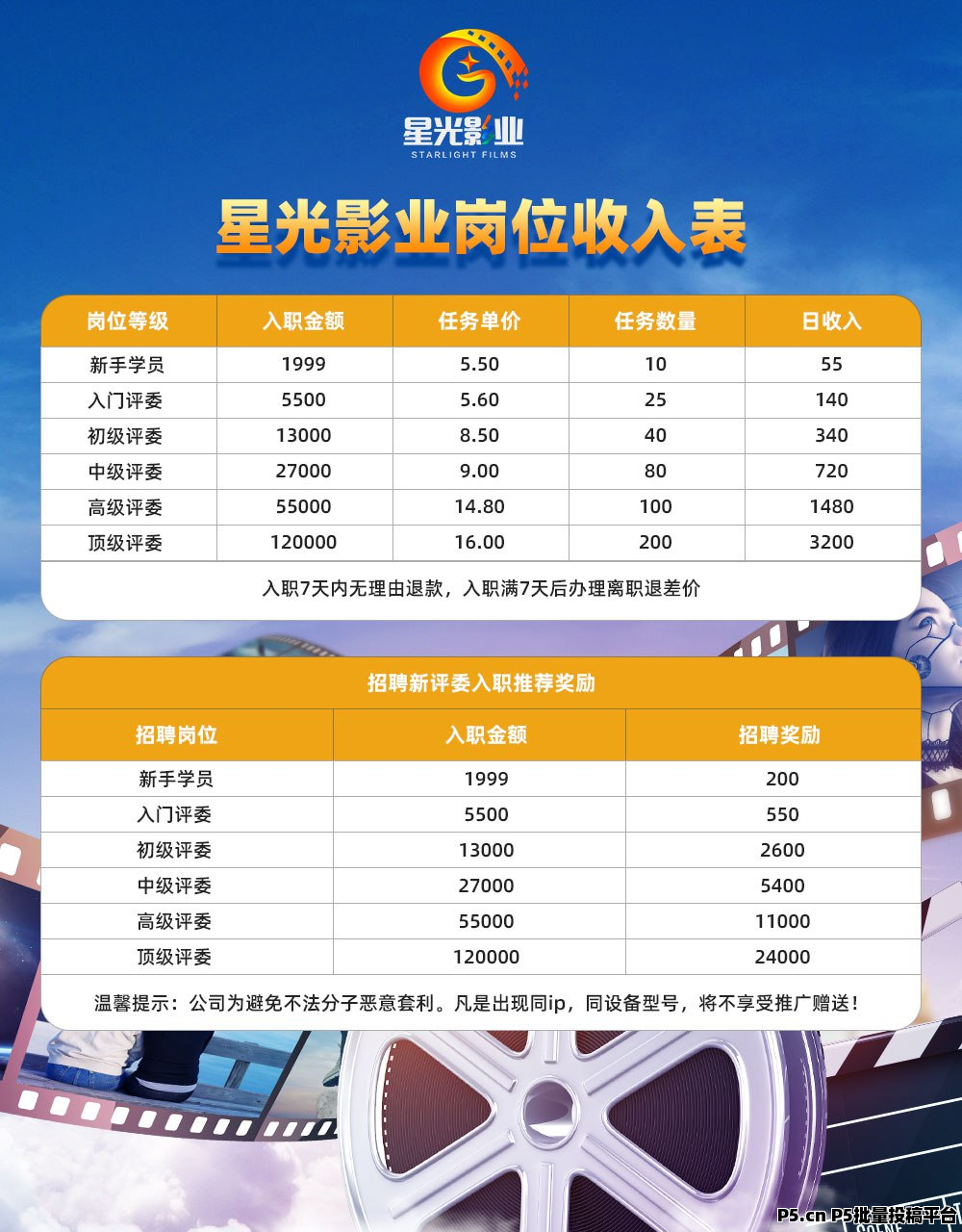 星光影业岗位最低的实习会员100元 每天可以做5个任务 10元 正式合作者 新手学员仅需1999元入职 每天可以做10个任务 每个任务获得报酬收入5.5元 简单轻松长久轻副业