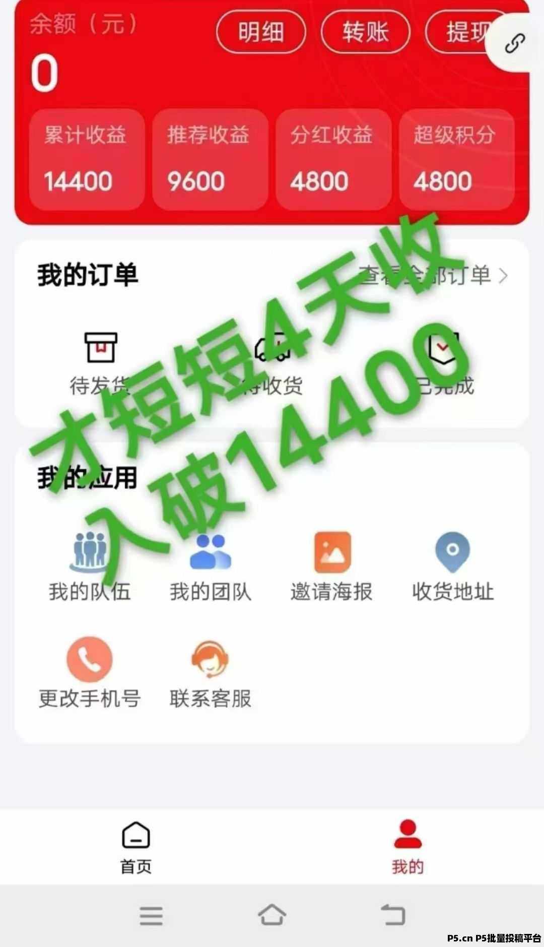 只需买600产品就能自动参与组队,直推300,7人组团自动出局得1200,循环组队循环出局拿分洪,日赚2400以上。