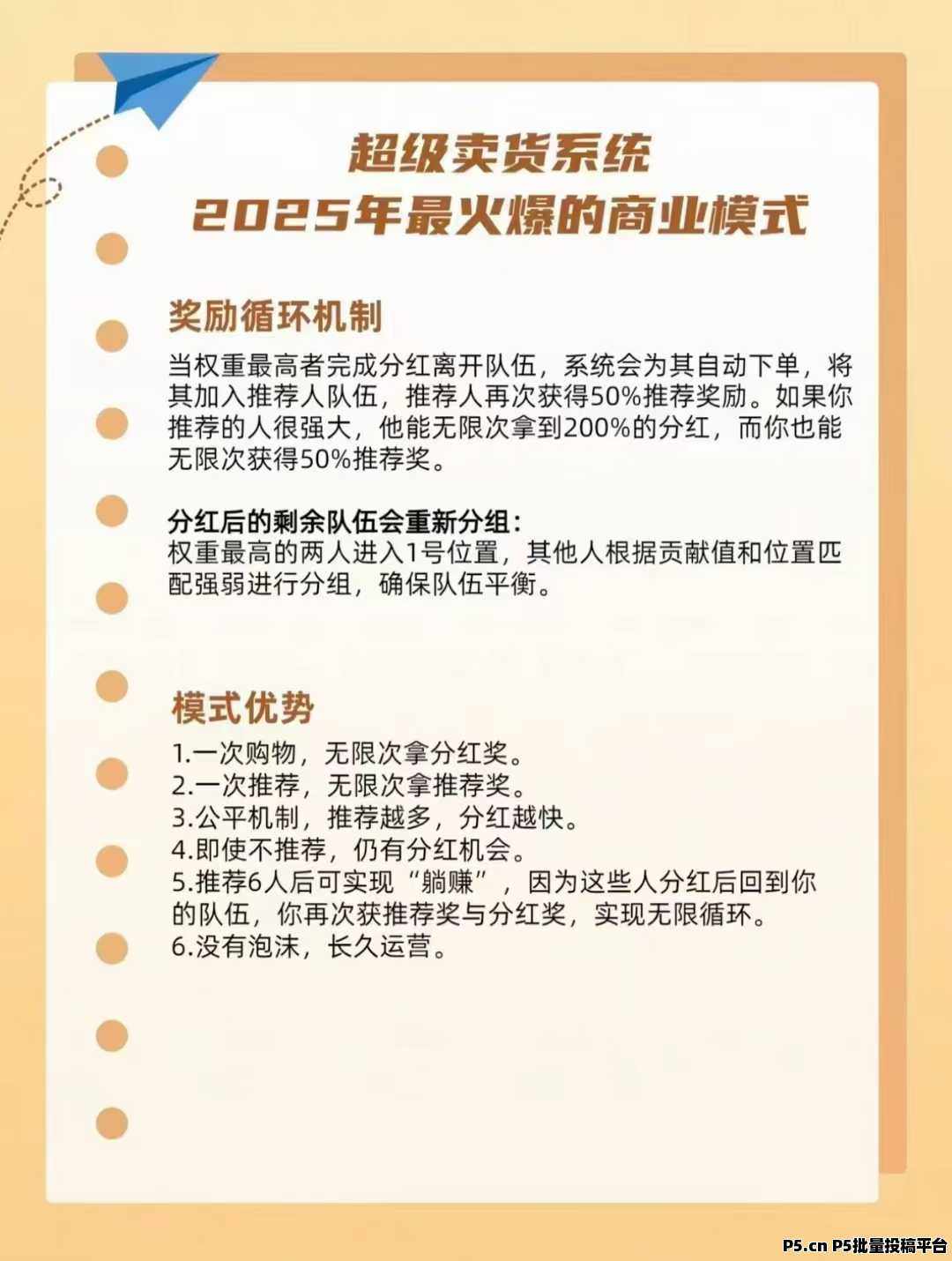 1、终身只投1单,即可无限循环组队,自动出局拿分洪。