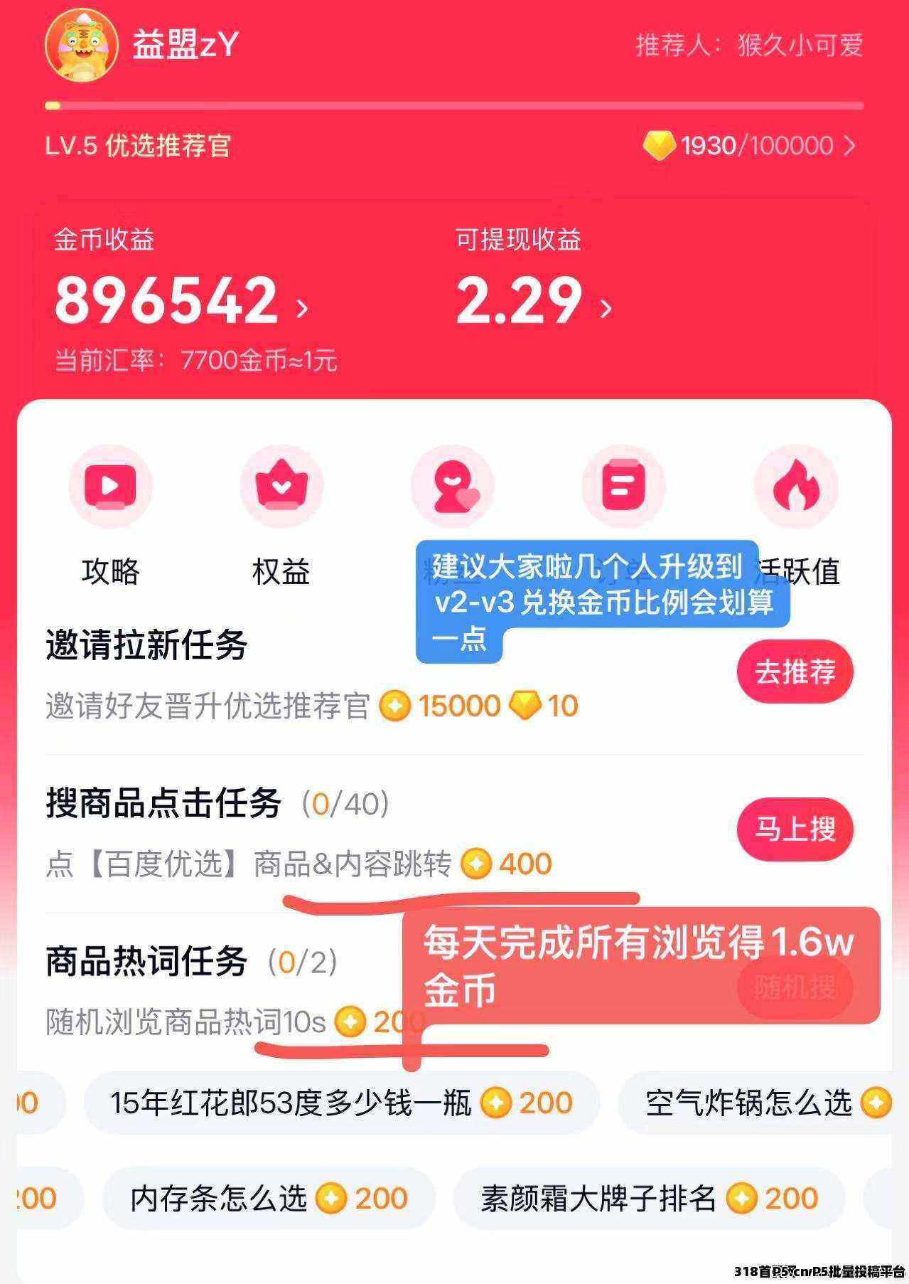 正文 百度推荐官复活,全自动挂机撸广告,每天低保收益 yimeng000148 V作者 /2025-02-12 15:41:42/941阅读 0212 百度推荐官低保每天1.6w金币里面有钱的可以去提现秒到zfb↓每日1-2亓左右 手机多的可以做做不限ip如图标记按要求搜索+浏览百度不倒项目不倒提现zfb秒到