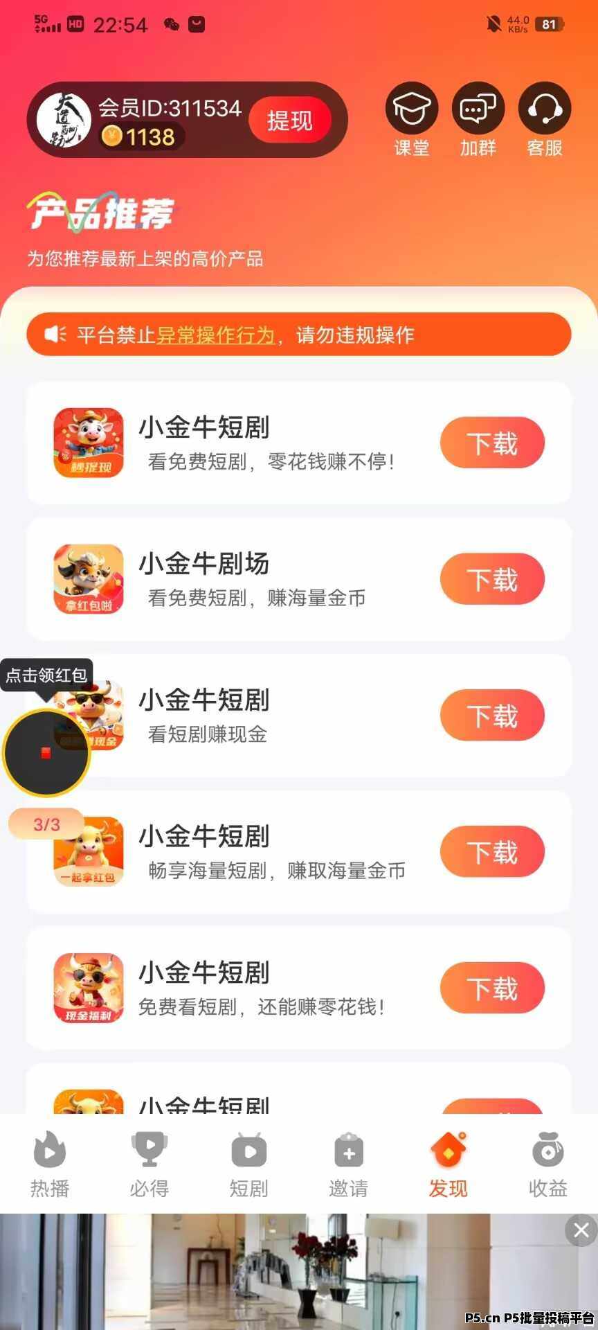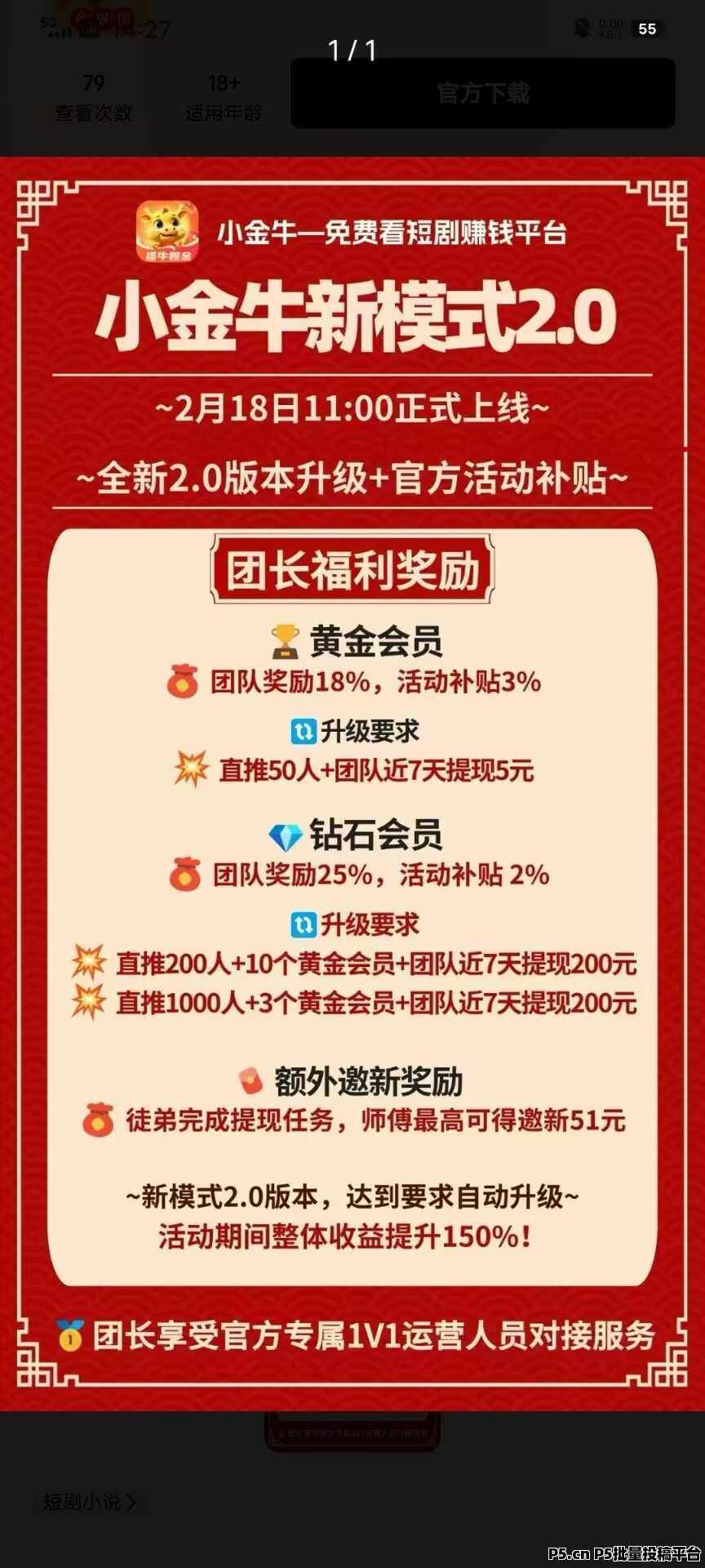 正文 小金牛短剧,广告单价高,保底收益,首码已出团长模式 fff68689fff000244 V作者 /2025-02-21 23:11:09/955阅读 0221 【小金牛短剧】广告单价0.2-0.5米,保底收益 首码已出 团长模式看剧鹿米小金牛2.0版0路撸天花板 大公司出品免费赚零花单机 一天10-30多机多份收益,看广告0.1~0.5提没有限制,全部秒到【浏览器扫码下载】内置几款**提供下载。全新2.0版本升级 + 管方活动补贴,福利加码,奖励更丰富!