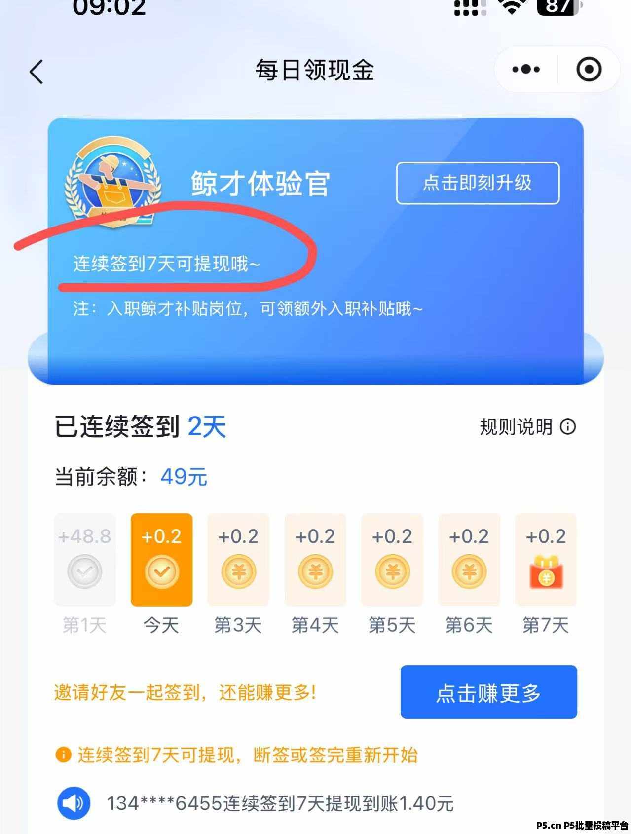 正文 鲸才招聘,无需下载,每天签到领钱 yimeng000148 V作者 /2025-02-22 10:19:34/1.3 K阅读 0222 微信小羊毛,每天签到0.2元拉一个能膨胀最高一个0.9元提现的话是签到7天后就行每周都可以撸,号多当低保