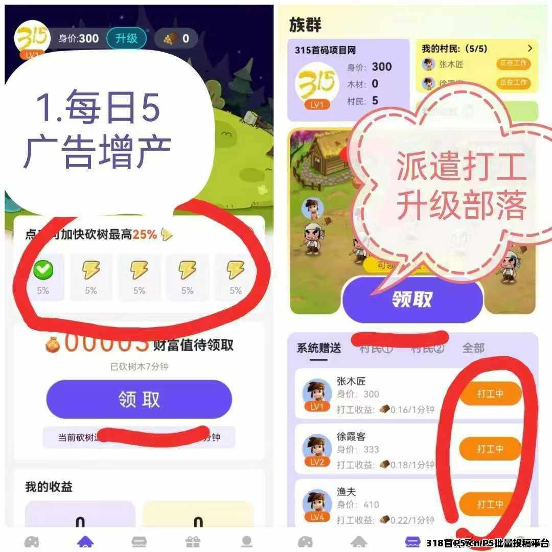 5,点击“族群”把下面所有工人都派打工,如果工位不够需要升级可以去,“福利”看激励视频,每个广告1000木材,lv1升lv2需要500木材