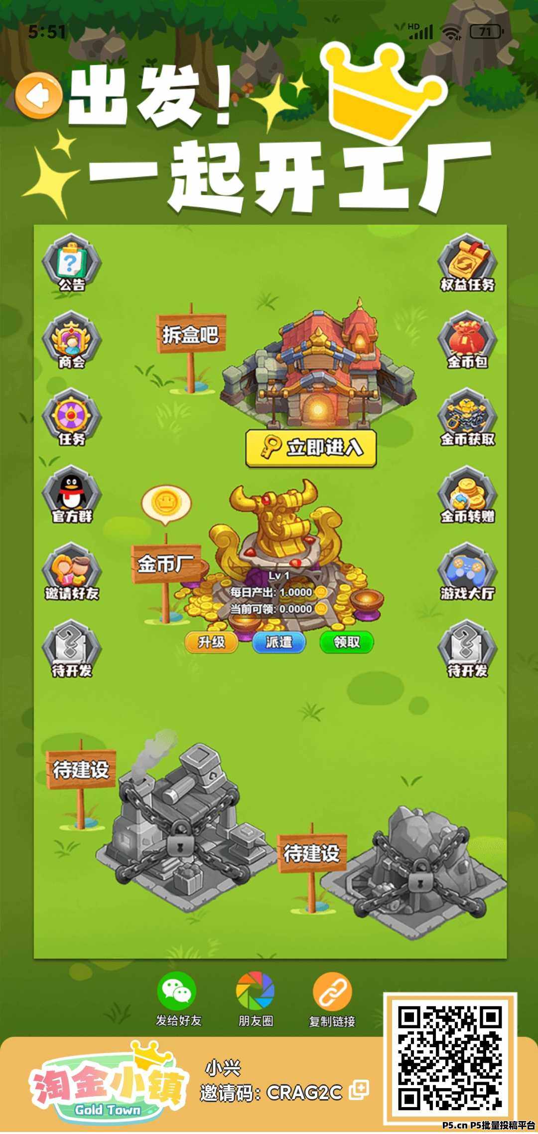正文 淘金小镇首码发布,零撸新项目,无广告纯挂机 小米0001947 V作者 /2025-03-09 14:19:46/690阅读 0309 0撸福利!淘金小镇,全程无广告,微信轻松登录,一人能注册三个号。每天点一下就能领金币,1金币≈1.7元,1金币起即可赠送。虽说赠送有50%手续费,好在三天就能卖出2个币。升级建筑,手续费最低能降至8%。邀请好友奖励超丰厚,直推拿8%,间推拿4%,**都有1%,赶紧来玩!qq:3264674850