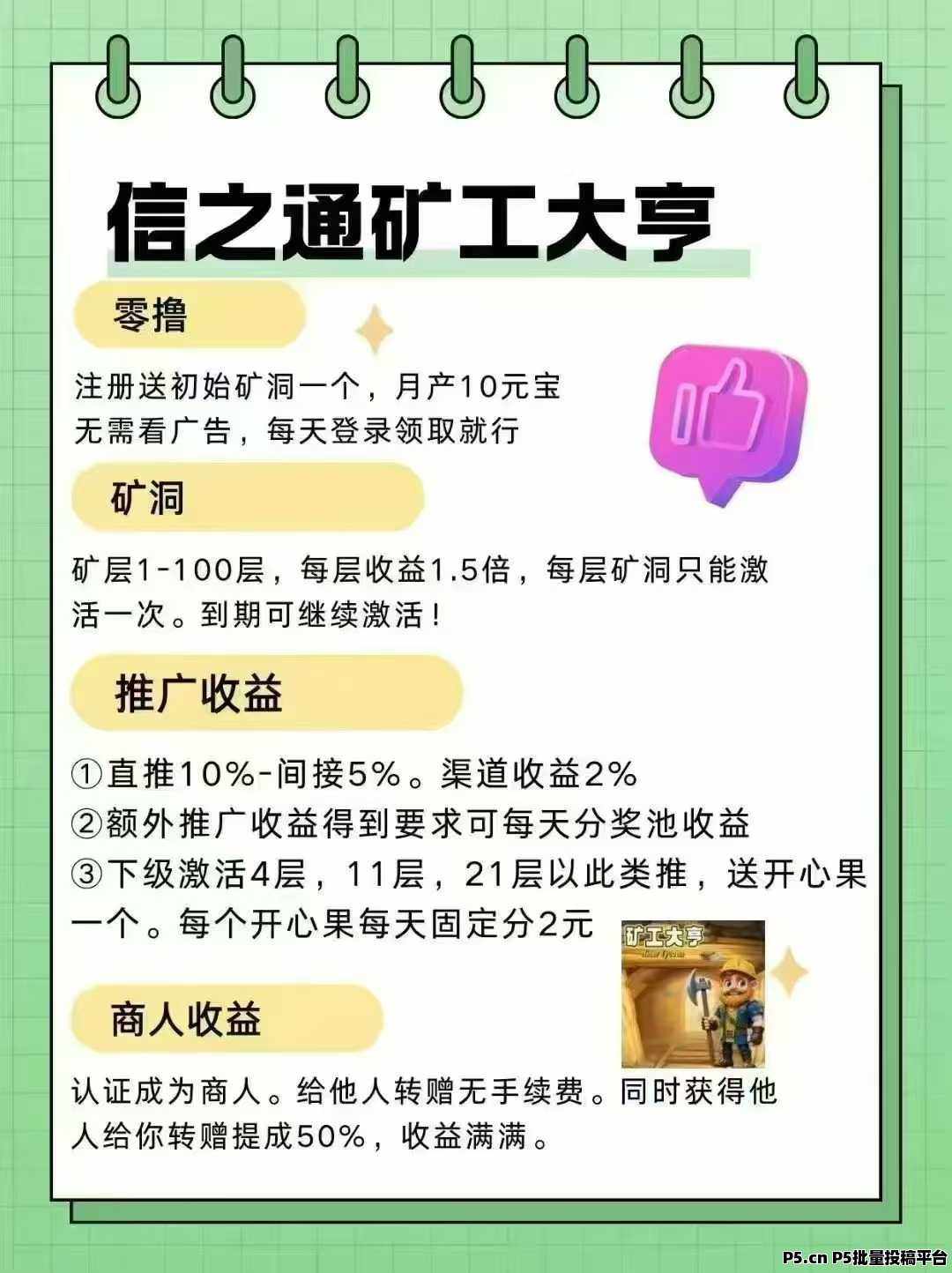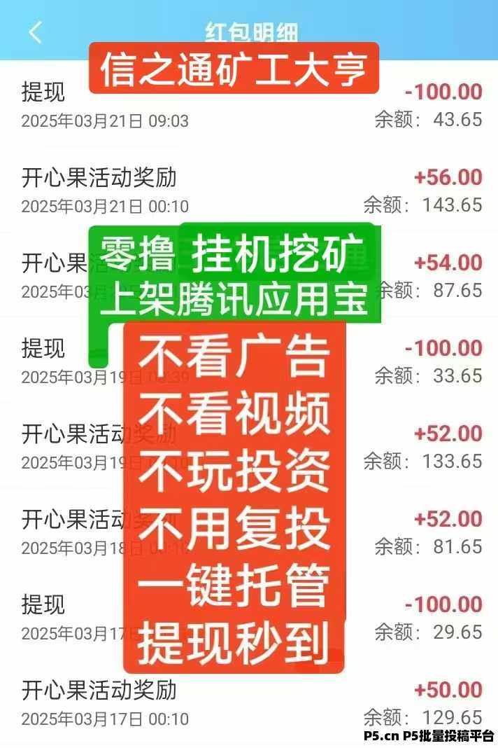 正文 信之通-矿工大亨,注册零红包,前提必须开通免费矿场 q192362914900001883 V作者 /2025-04-03 11:14:21/877阅读 0403 项目介绍项目介绍信之通——矿工大亨,下载领6.88,每天挂机**,月撸几百,零撸玩法——24小时一键领取加QQ3940046307投入玩法:买元宝激活4层矿洞,收益更暴力!