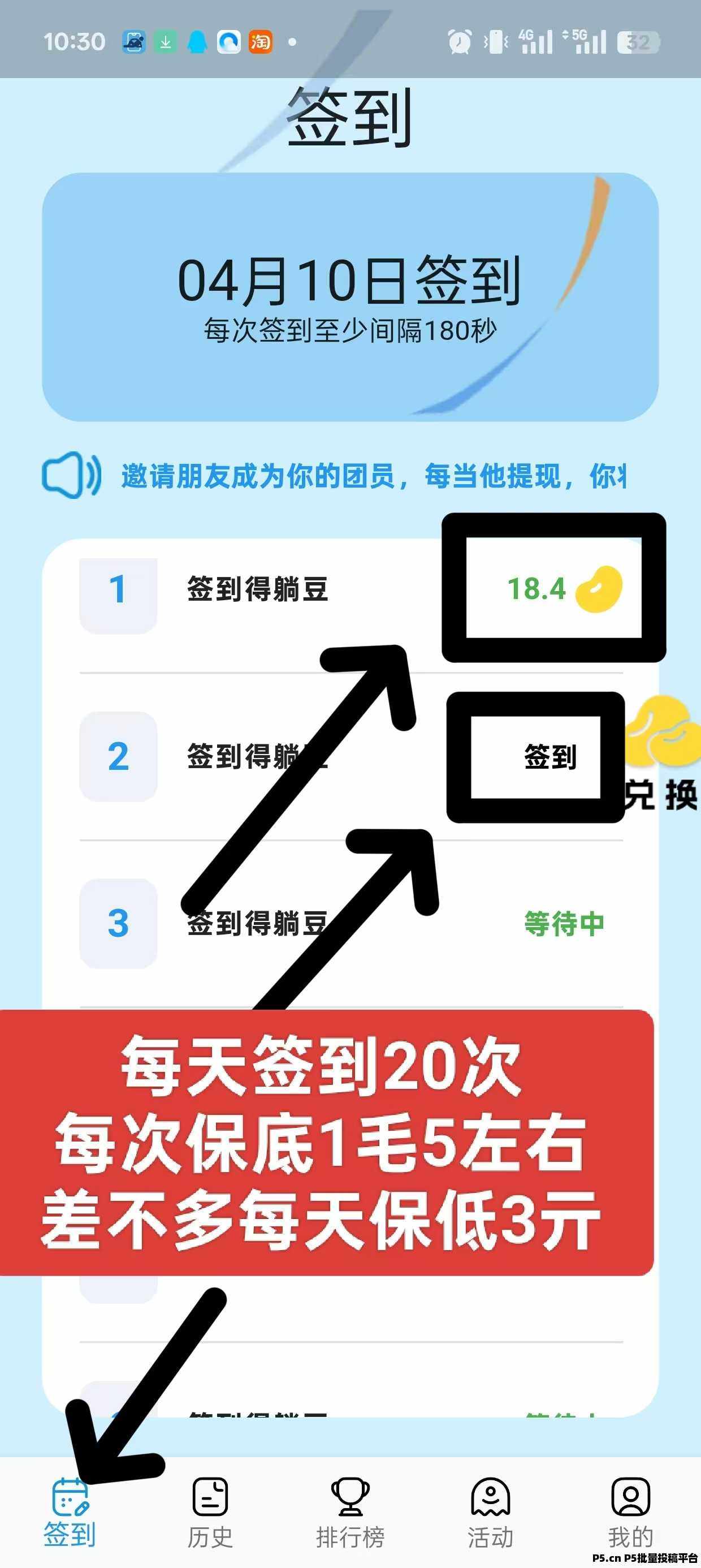签到躺豆一天20次,一次10-15,12*20=240躺豆,