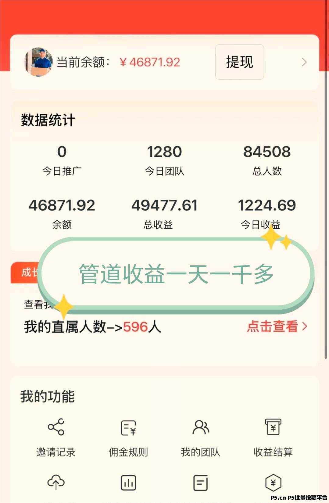 直推 10 人,每人再推 100 人,团队规模 1000+,团队每单贡献0.1 - 0.5元,如此一来,若达成1万单,每月便可收入5000元。