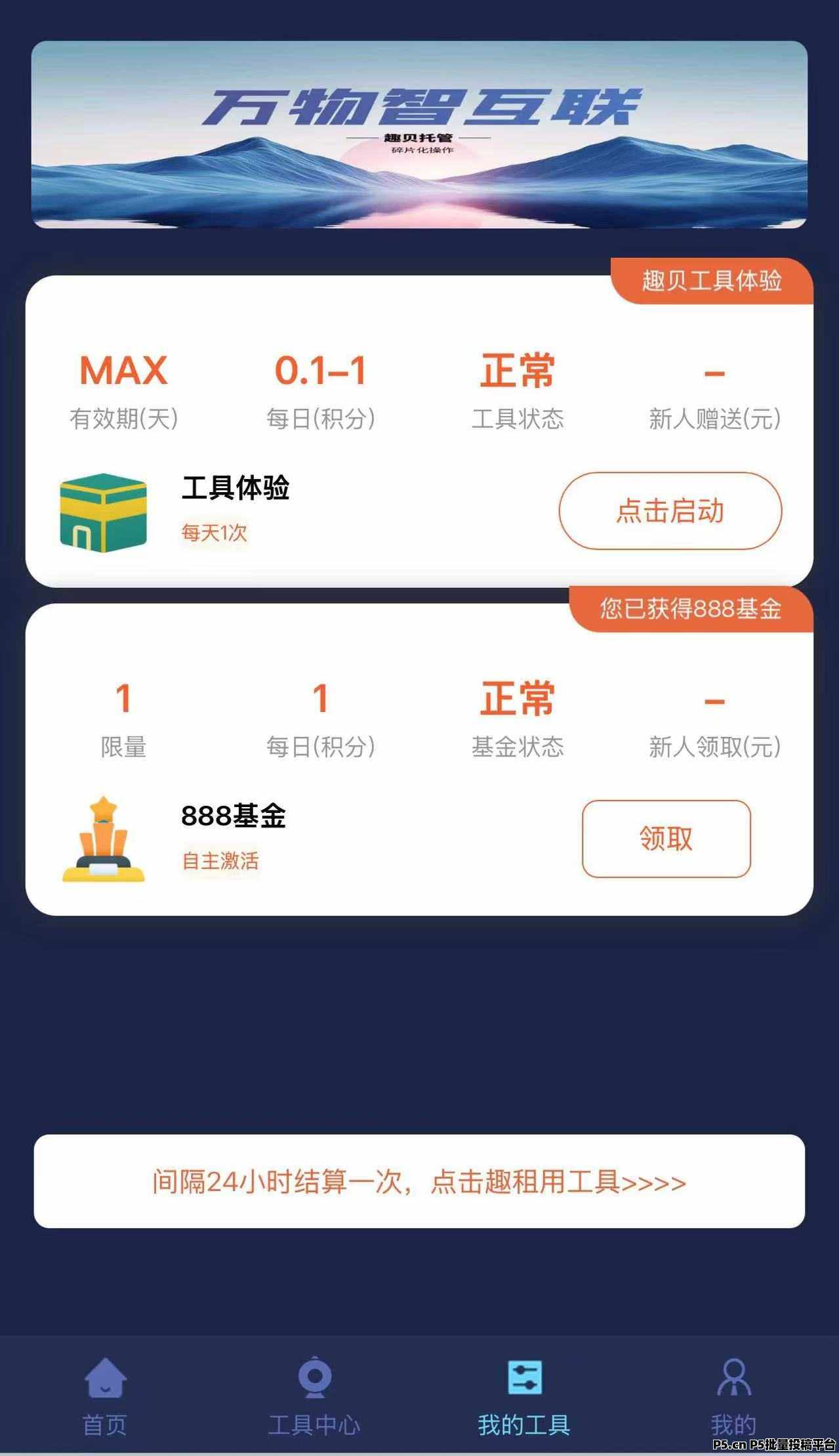 注册赠送888基金,租用工具激活一天收益1积分(一元),直推租用工具奖