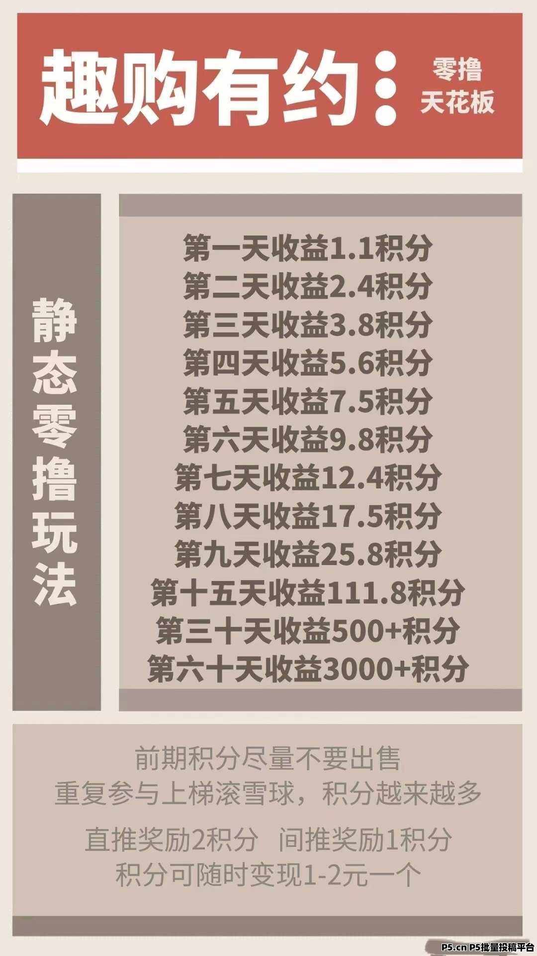 趣购有约是一个零广告的稳定上墙项目,让用户在无干扰的环境下轻松赚取积分。新用户只需完成注册和实名认证,即可进入个人中心点击“积分上墙”开始操作。每天坚持上墙,尽可能把积分用完,如果积分不足,可以通过多种方式赚取。简单操作,每天只需几分钟,一个月下来轻松获得200到300积分,收益无上限。