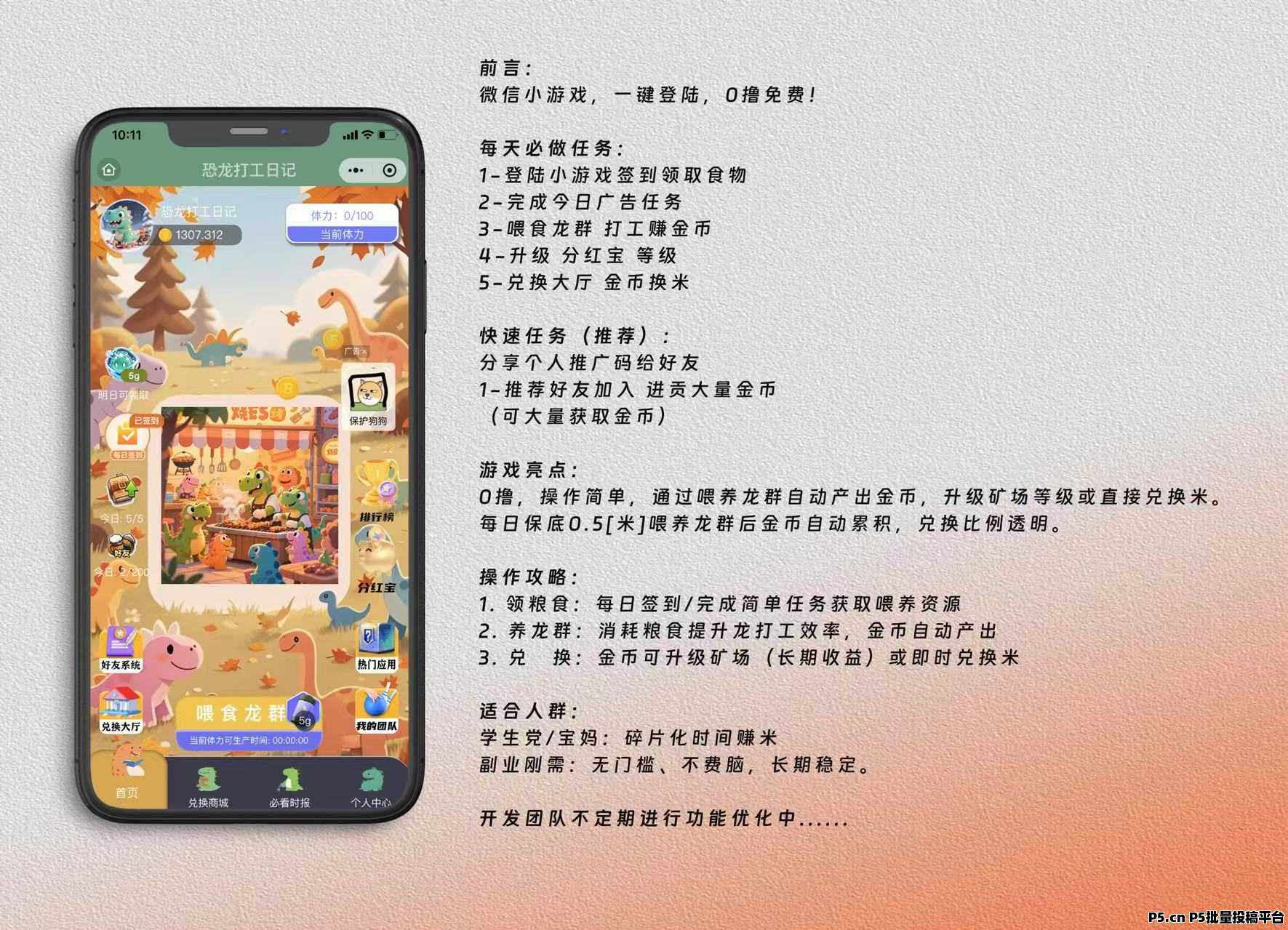 正文 恐龙打工零撸**,大逃杀模式明天即将上线 zhuzi123000612 V作者 /2025-04-27 08:25:43/877阅读 0427 恐龙打工零撸**,大逃杀模式明天即将上线看看广告签签到获取体力体力喂养龙获得金币金币可以直接兑现或者升级**宝明天可以参与大逃杀游戏