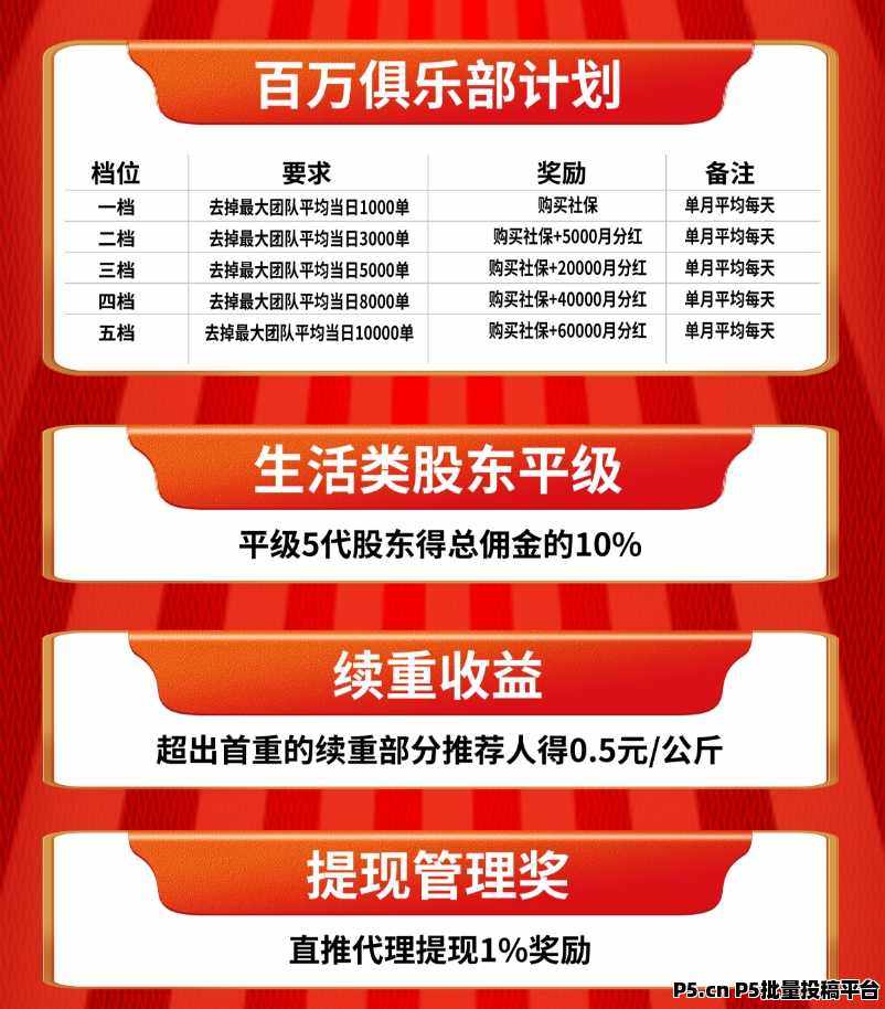 第四、正运通全行业首创,百万俱乐部计划+全民社保-快递全民日芬红+模式 把利润全部放出来给到合作伙伴,最低5000/月+购买社保,最高6w/月+社保生活服务类板块5dai平级股东佣进10%奖励,直推提现奖励1%