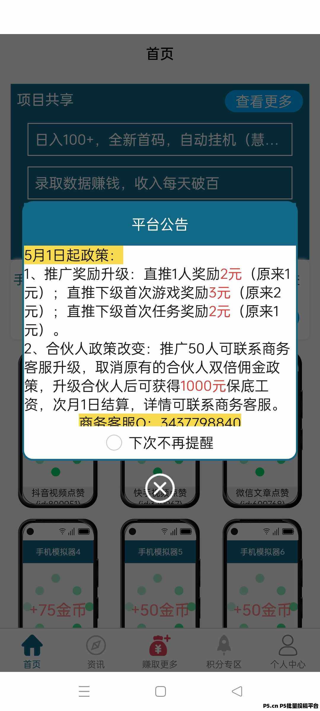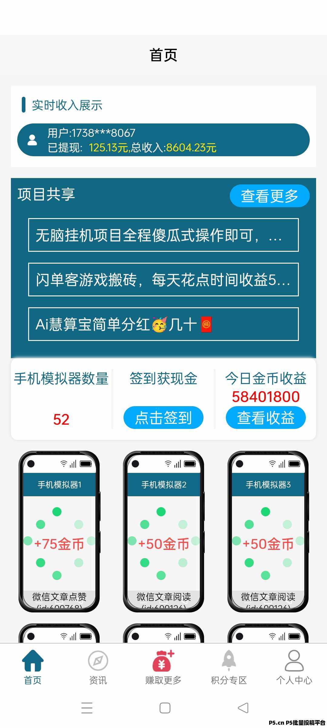 正文 0撸项目,云自动挂机**收益 康康首码0002363 V作者 /2025-05-07 09:17:50/1.37 K阅读 0507 云自动,获取云手机自动卦机收益,云手机越多,收益越高首次邀请好友送5台云手机,后续邀请1好友赠送1台云手机,需要绑定支付宝账号才有收益,本人亲测已提现到账。通过试玩游戏、悬赏任务、看视频都能获得云手机。